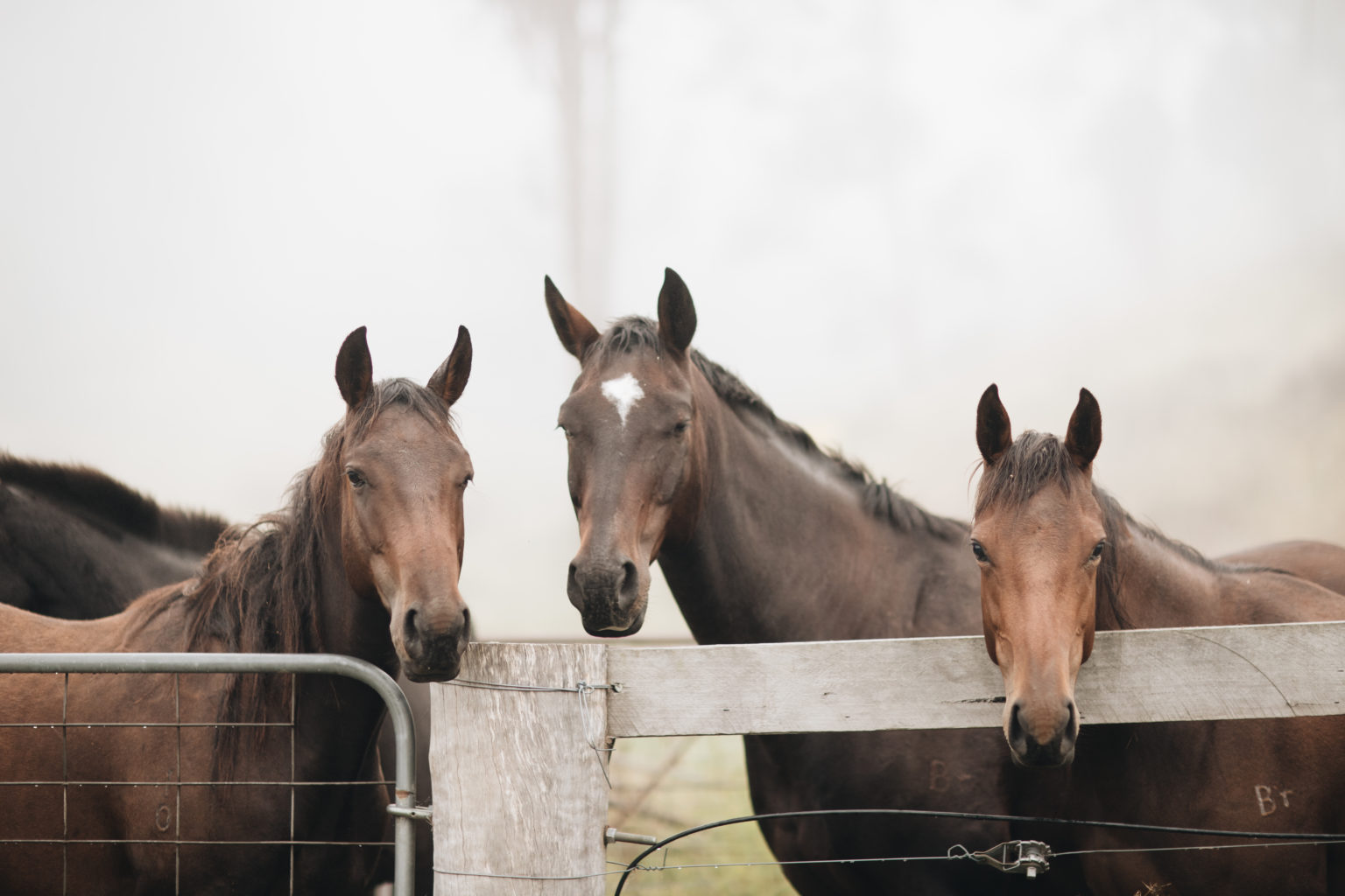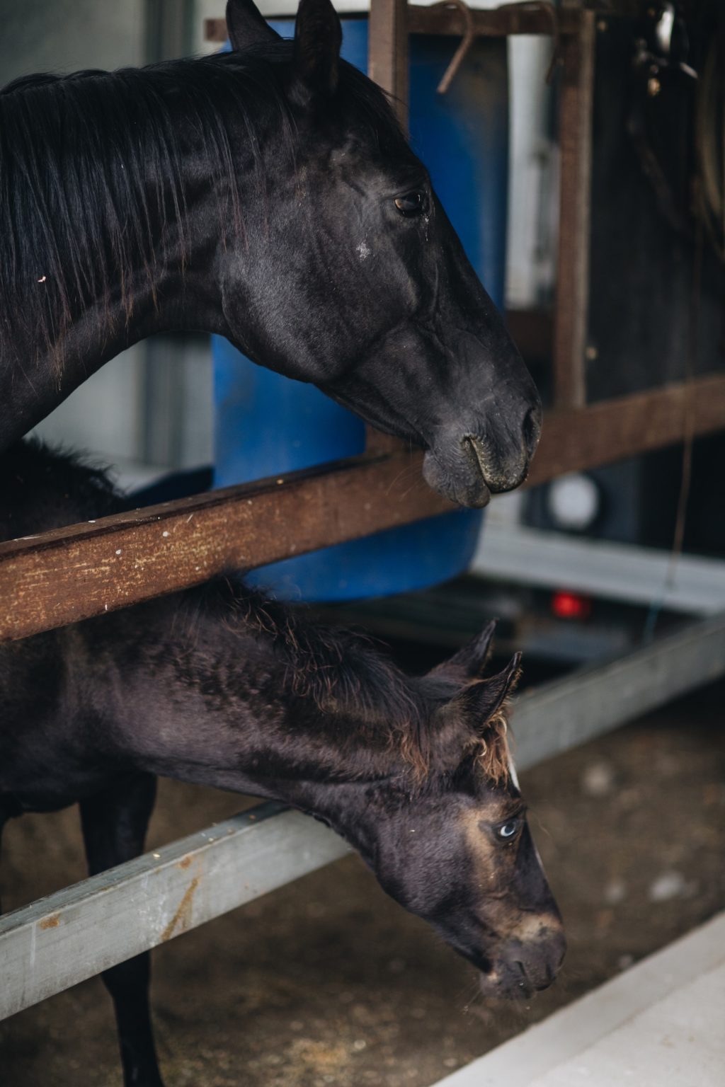 The brown mare looks inquisitively over the gate as the feed shed door swings on its hinges. Her nostrils flare and she nickers excitedly to the sound of the chaff being scooped into a bucket. A colt foal emerges out of the early morning mist, floating in pale grey drifts above the grass, and softly butts her flank. A rich dark chocolate colour, just like his mother, he jumps skittishly into the air before the pair move out of the hillside paddock and into a stable for their breakfast.
