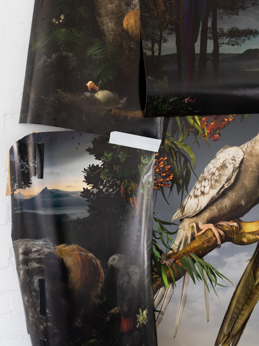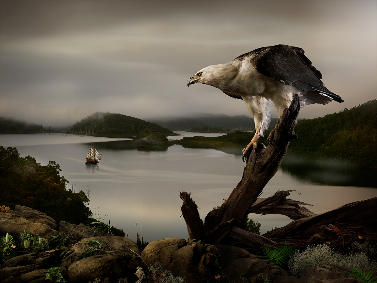 McGlennon’s series Thylacine 1936 envisions the apex predators, the Tasmanian tigers, hunting and reigning supreme in their natural habitat. Often depicted atop mountains, the tigers are portrayed feasting on the carcass of an introduced chicken, with a tall ship visible in the background. Unaware of their impending doom. First contact between species, and for many species is utterly devastating. And macabrely enough, the Last Tasmania tiger, froze to death in Hobart Zoo in 1936 because a keeper forgot to house the animal overnight in winter.