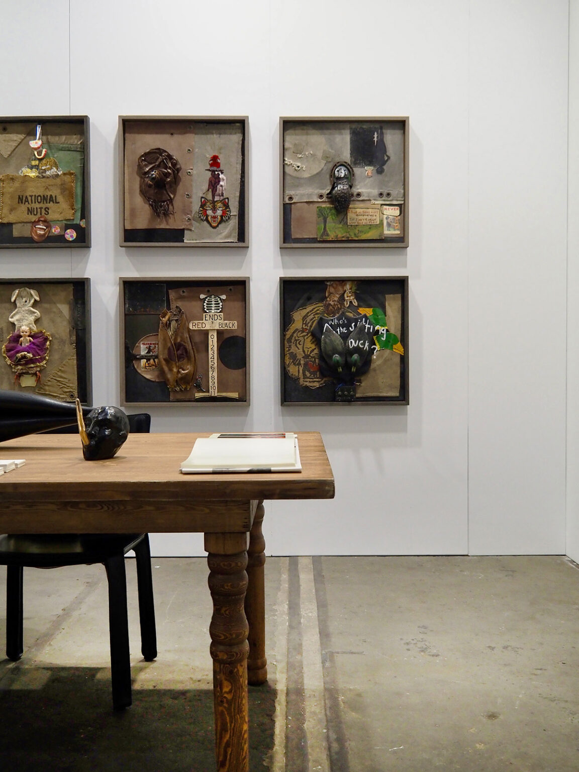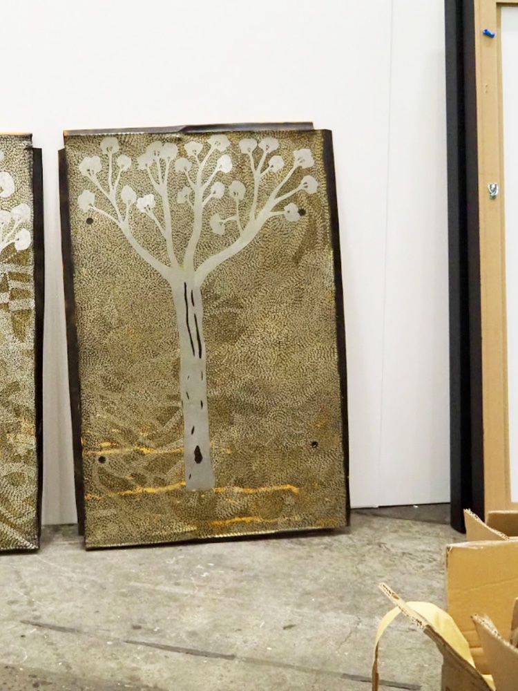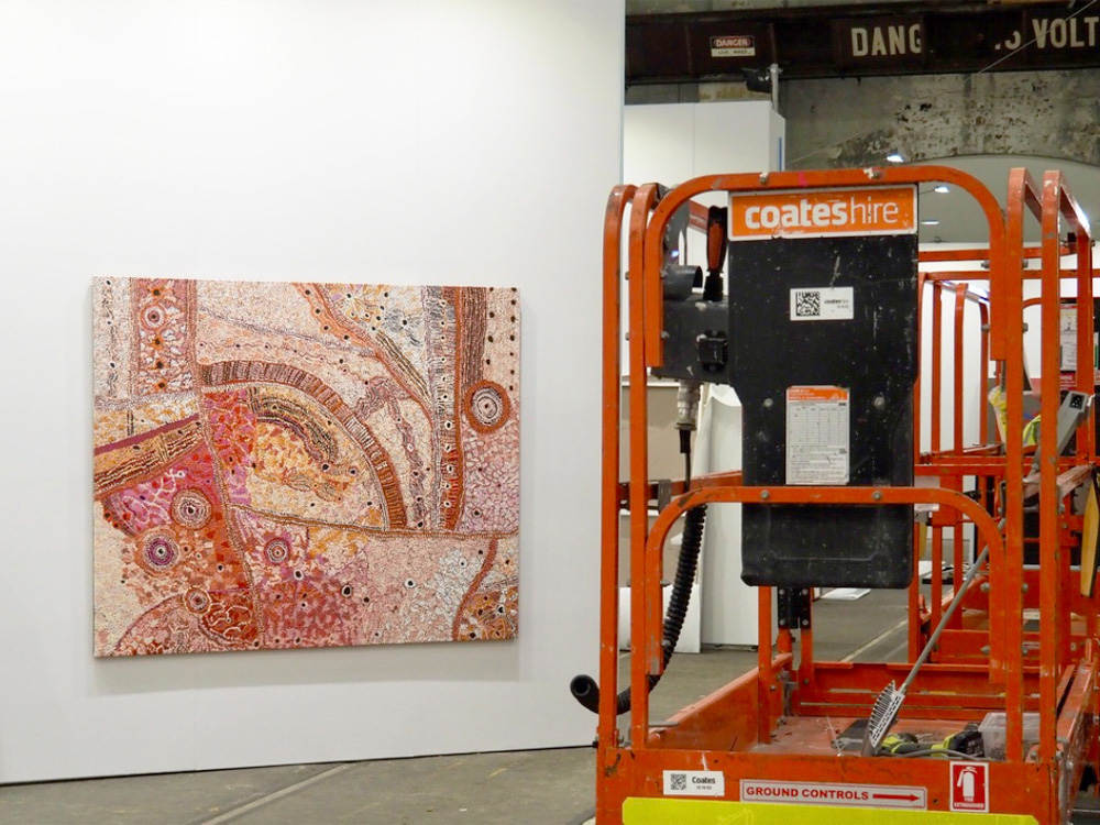 So much talent and too much terrific work to list, although I keep thinking about Gaypalani Wanambi. On install day, I was hanging out at Michael Reid’s stand as Toby, Daniel and Will positioned art, ready to hang. Among a flurry of levels and drills, frames and bubble wrap, I saw a couple of battered old road signs leaning against the wall. With so much construction paraphernalia whirling around I wondered where, between the hard hats and cherry pickers, they fit in. Peeking behind, Wanambi’s sublime etchings were revealed. A moment of pure joy – much like rediscovering Wiggan’s Ilma.