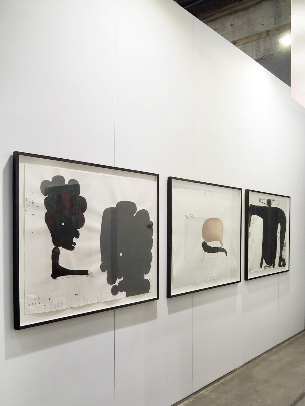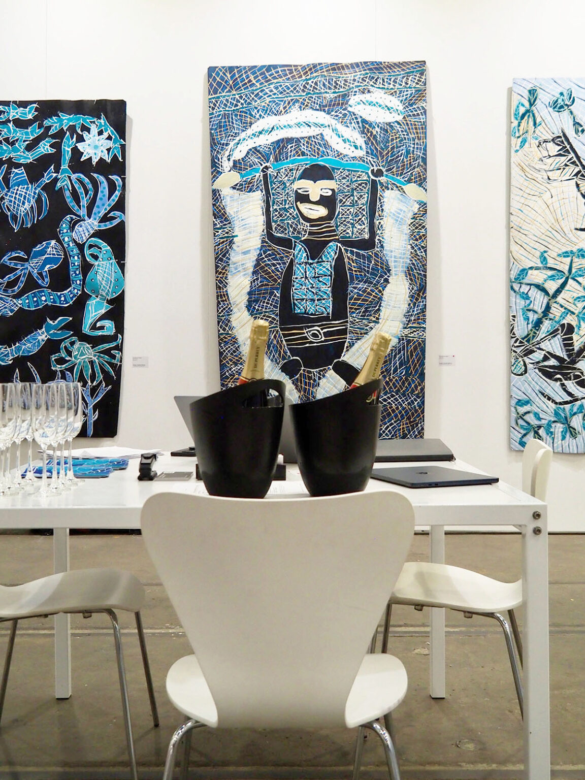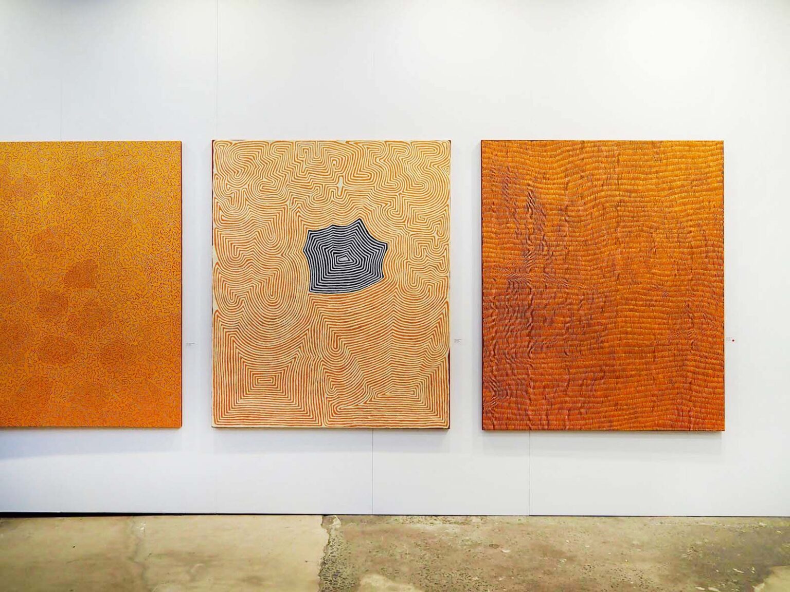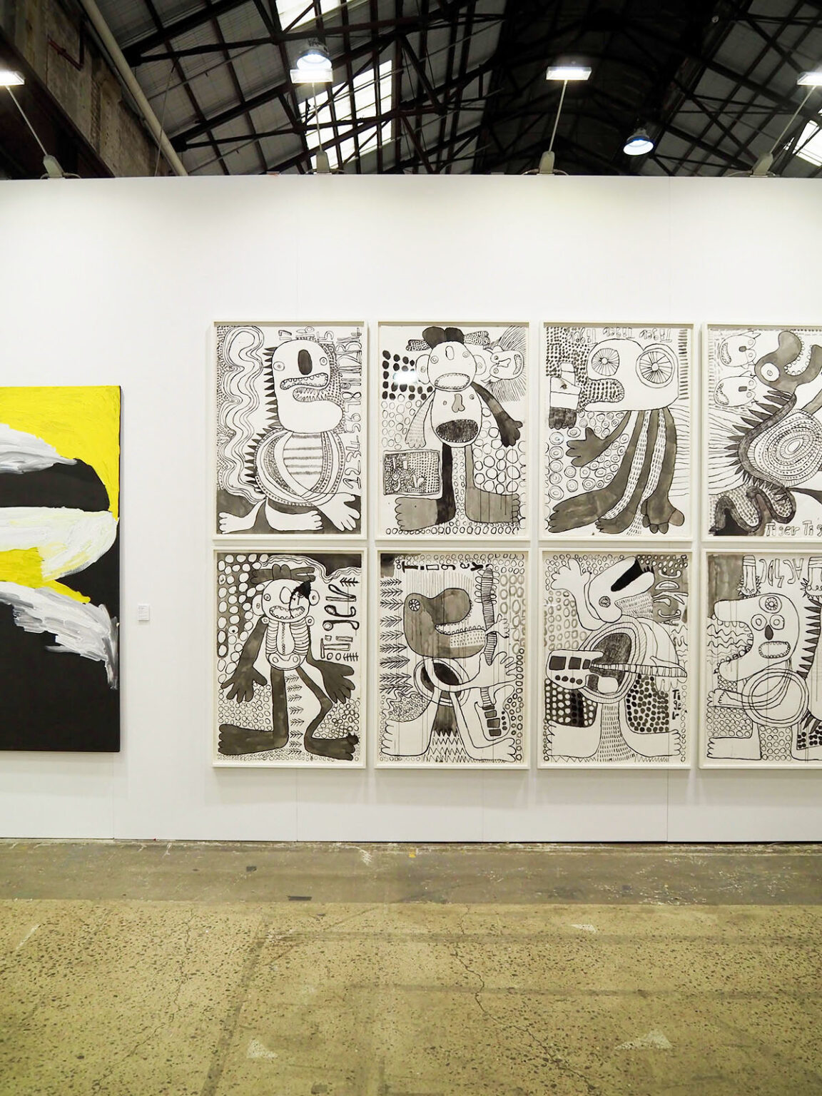 For me this year’s fair was looking only, although I imagined what I would have bought had I been cashed up. Monochromatic works on paper such as Godwin Bradbeer’s Performance Suite 10, Homage to Stelarc #2 at James Makin Gallery, and the wall of Tiger Yaltangki’s Malpa Wiru (Good Friends) at Alcaston were definites. Wiggan’s Ilmas and a lineup of Dhambit Munuŋgurr’s exuberant bark paintings for sure.