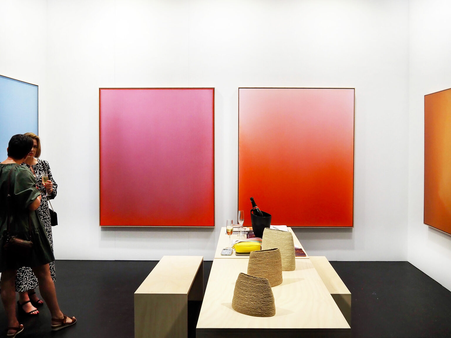 I’d design a whole room around the monumental canvases by Virginia Cuppaidge at Nicholas Thompson Gallery, including the six-metre-wide Cytheria, a delicate gradient of yellow to lilac and orange marked by the odd Miró-like line; and another room for Archie Moore’s suite of skin-coloured shapes alongside Box Sculpture by Augusta Vinall Richardson at The Commercial. And hard to say no to one of the blocky Anthony Gormley sculptures at Galleria Continua from San Gimignano, an exciting addition to this year’s fair.