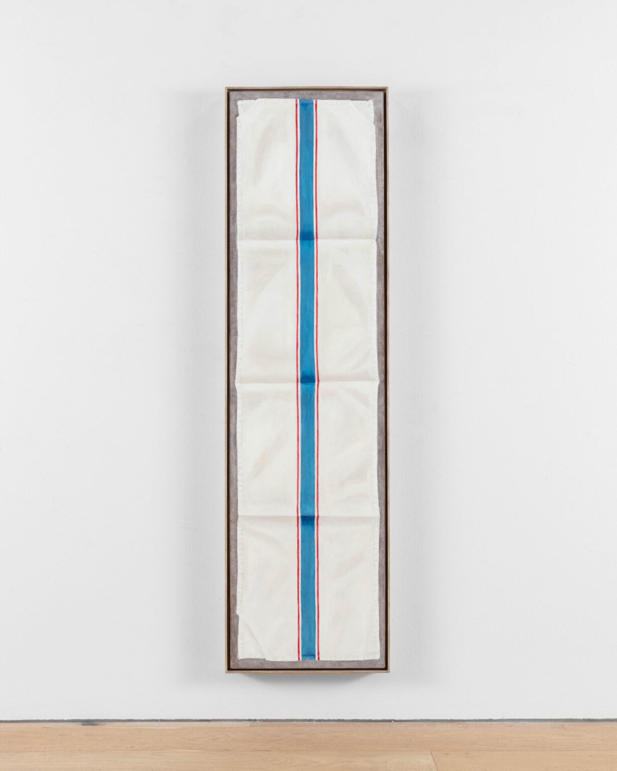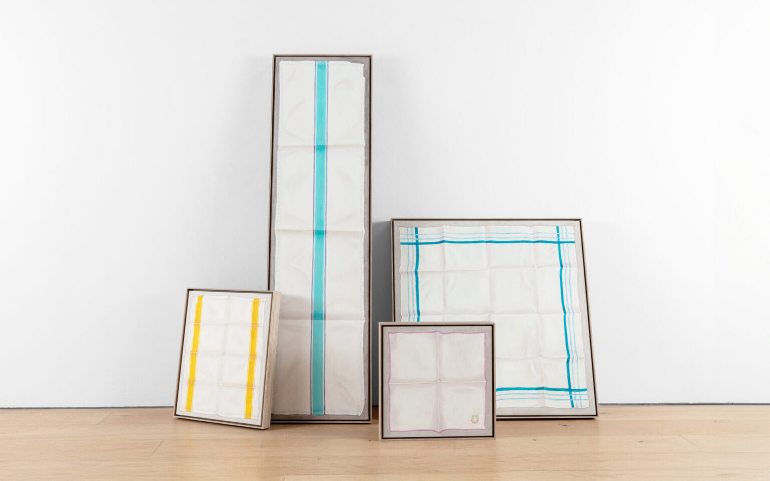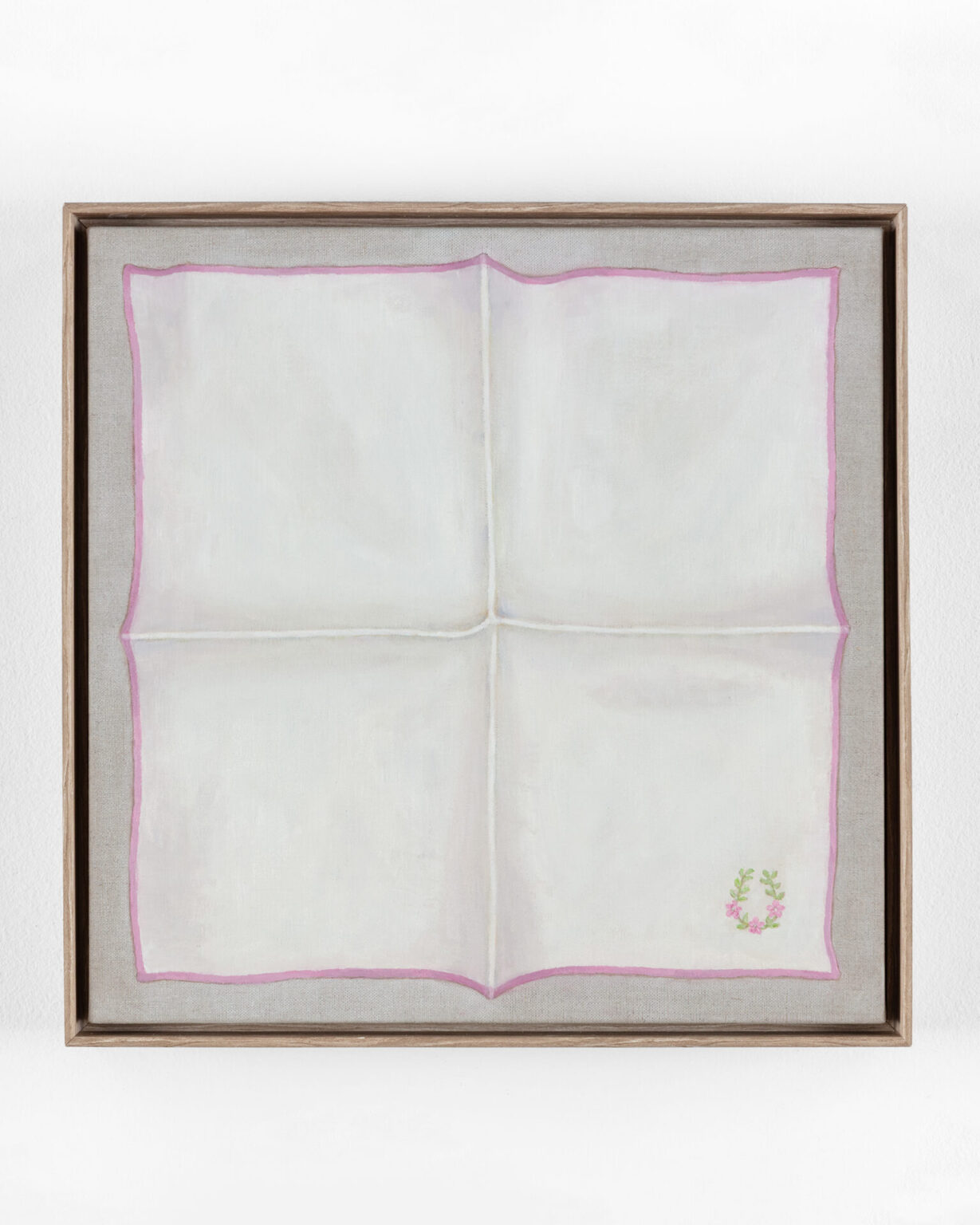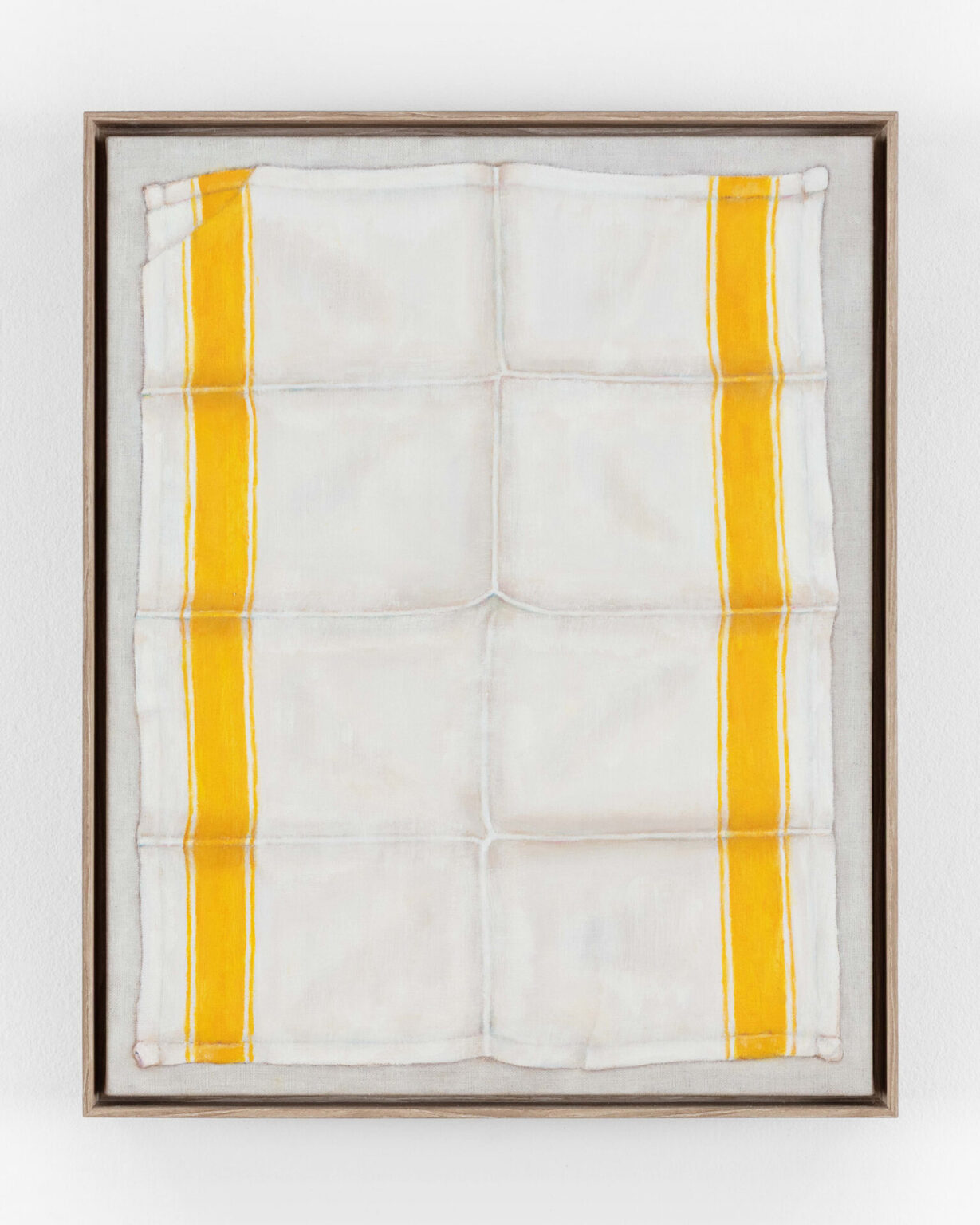 In her confidently pared-back, richly nuanced paintings, Stack deftly expands the parameters of the still-life genre by isolating everyday textiles – handkerchiefs, table runners, tea towels – and rendering them with luminous precision and striking depth. Drawing an unlikely connection between humble, handmade domestic keepsakes and the spare geometries of minimalist art, Stack’s painted linens register folds and creases as subtle traces of human touch, inviting a visual tension between gridded order and organic irregularity.