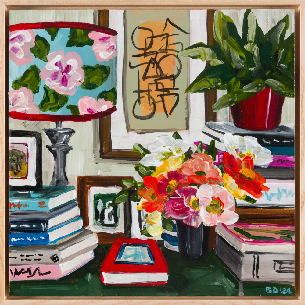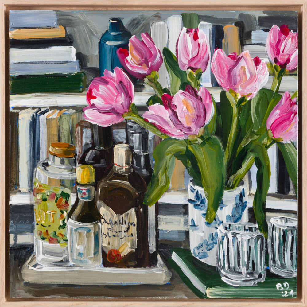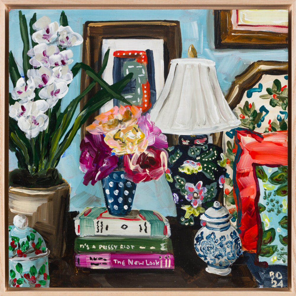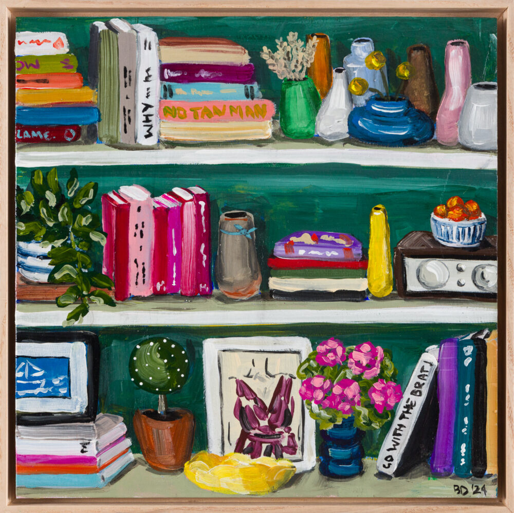 Narrabri-based artist Brooke Dalton invites the viewer into a fabulous world of interiors with her new series of paintings, conjuring bookshelves and tabletops that burst with a whimsical abundance of collected curios, colourful volumes and a vibrant tangle of orchids, tulips and other spring blooms.