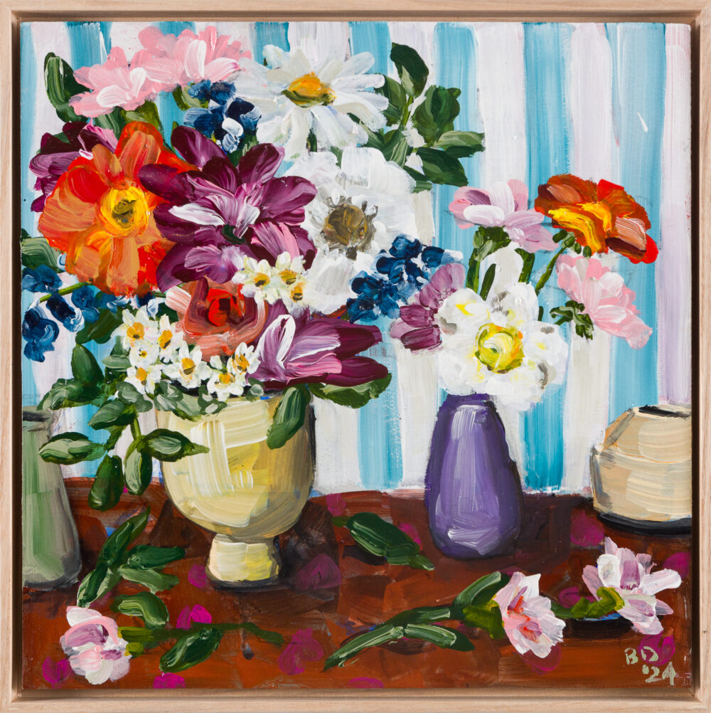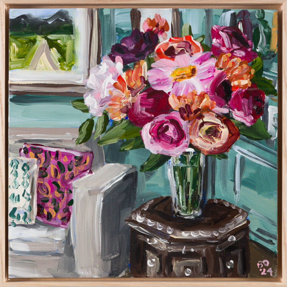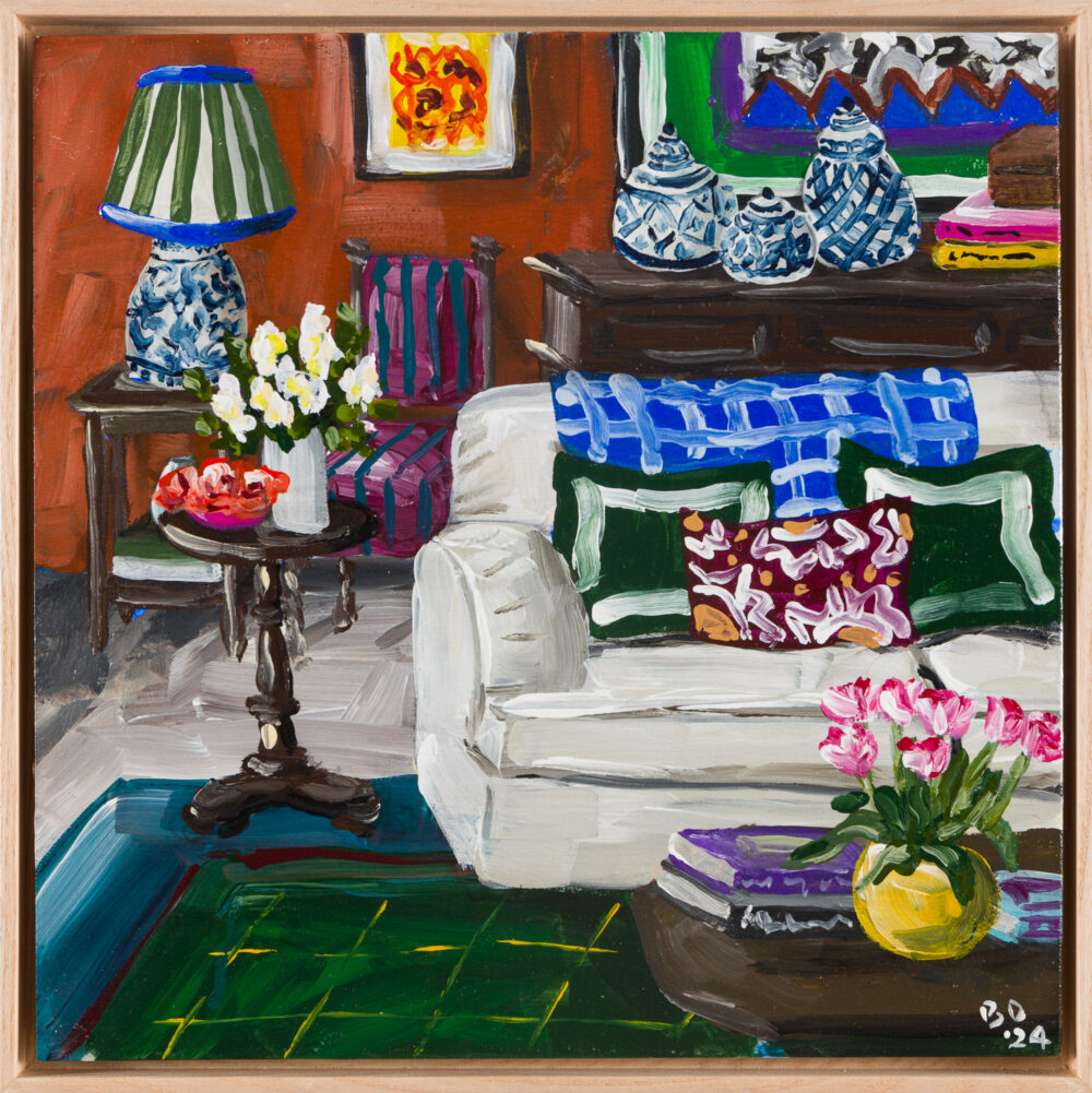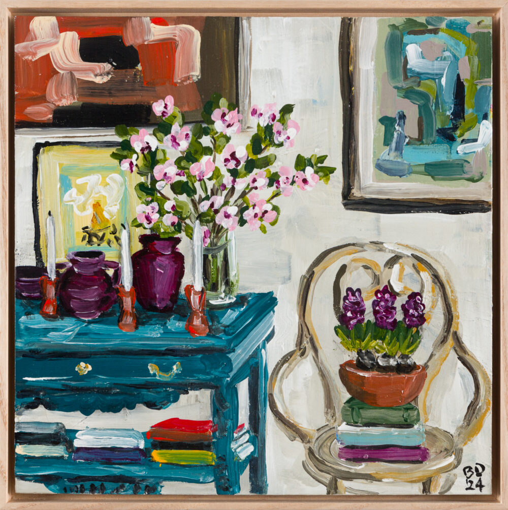 Narrabri-based artist Brooke Dalton invites the viewer into a fabulous world of interiors with her new series of paintings, conjuring bookshelves and tabletops that burst with a whimsical abundance of collected curios, colourful volumes and a vibrant tangle of orchids, tulips and other spring blooms.