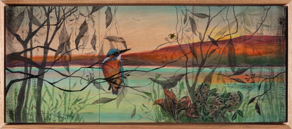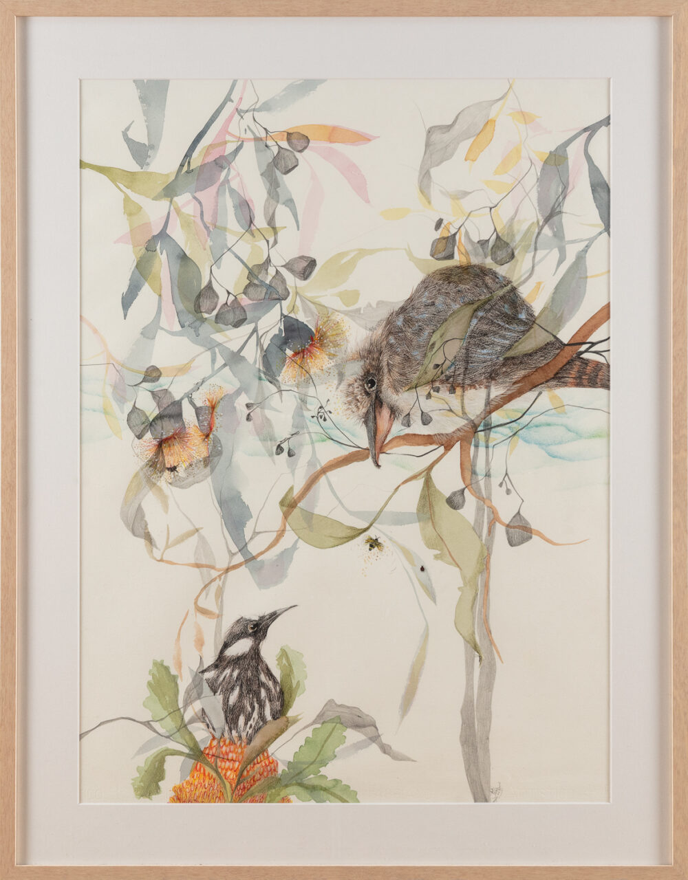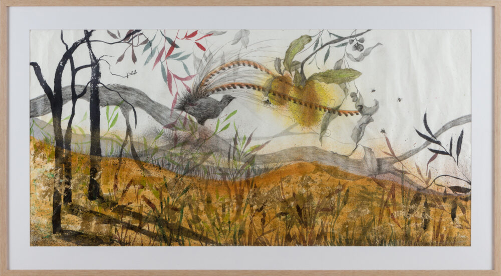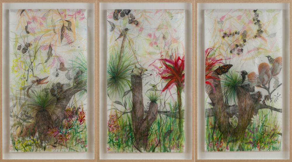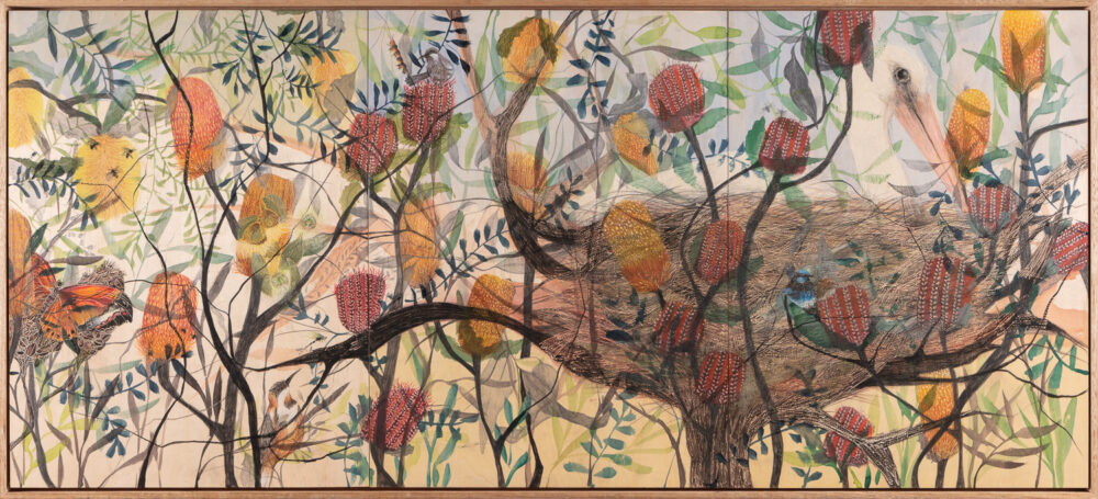 “From top to bottom, left to right, Allcorn’s paintings read as if you are standing within a grove of native trees,” writes Michael Reid OAM of the exquisitely layered thickets of Australian bush brilliantly conjured by the artist with her fine, wisp-like strokes and smatterings of gold-flecked magic.