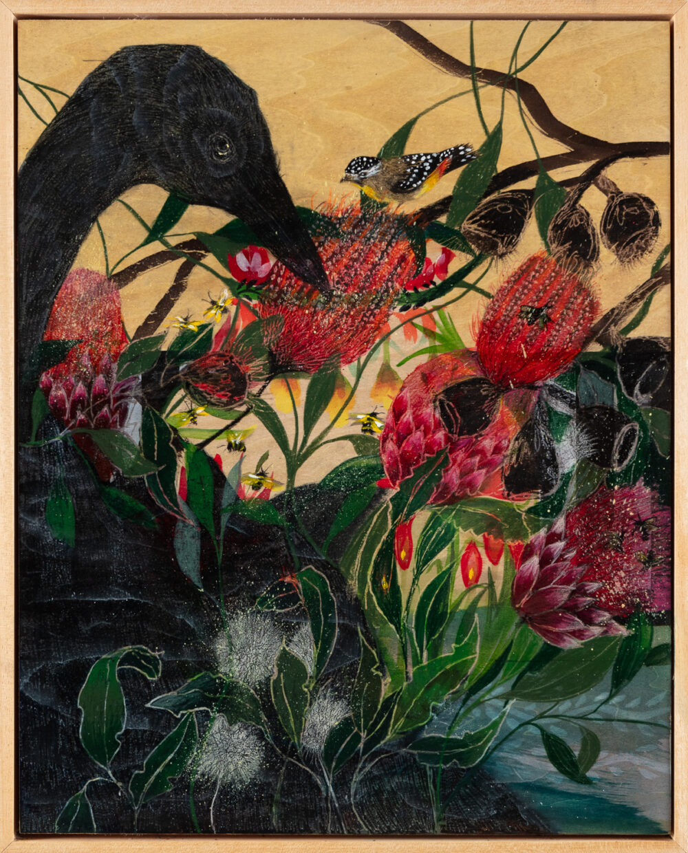 After being thrust into major art collector conversations in 2022, when the Art Gallery of NSW selected her as a finalist in both the Archibald Prize and Wynne PrizeJulianne Ross Allcorn makes Michael Reid Murrurundi debut with an exhibition of paintings conjuring magical impressions of the Australian landscape. In these utterly original works, charismatic critters are glimpsed through overlapping flora and wispy layers of eucalyptus against smatterings of glitter and areas of exposed plywood.