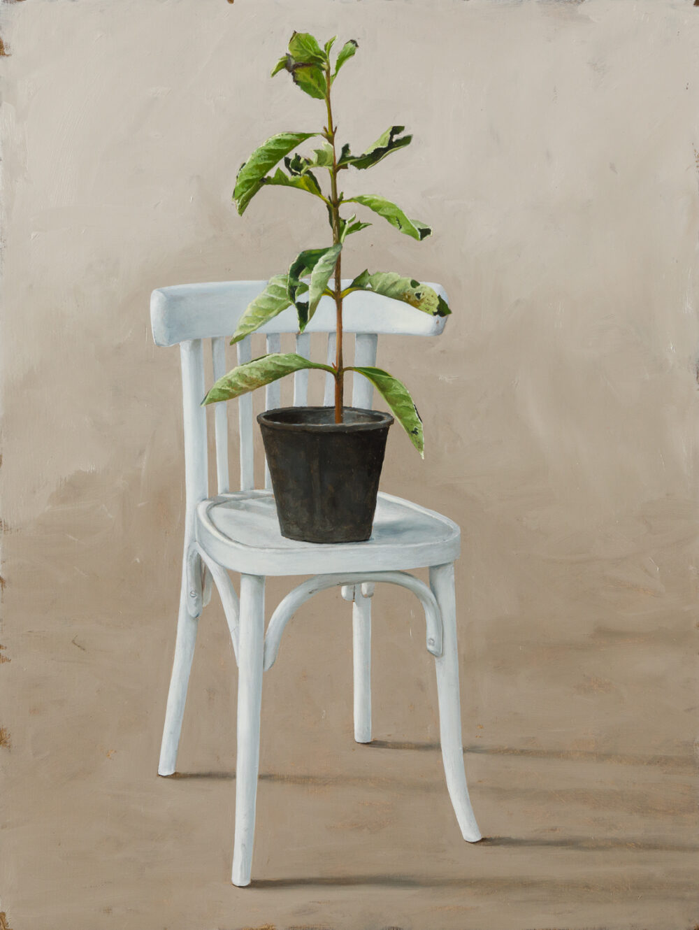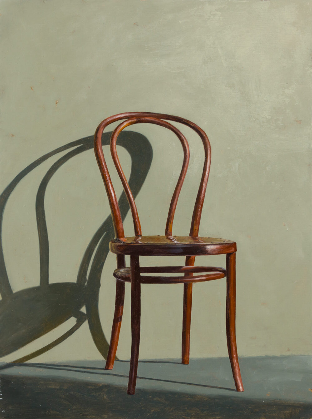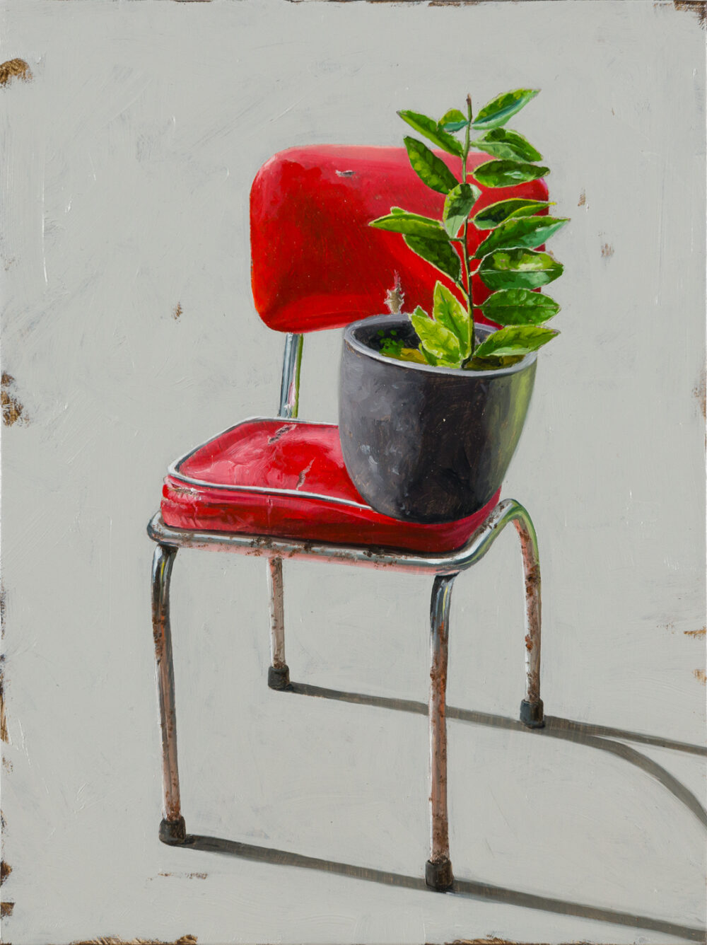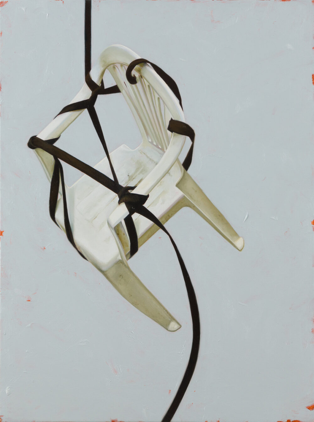 Gustafsson’s compositions ignite a striking interplay of natural and designed elements. Through her recent paintings, the artist recasts chairs as sculptural subjects that strike playful poses, set against minimal spaces of ambiguous planes.