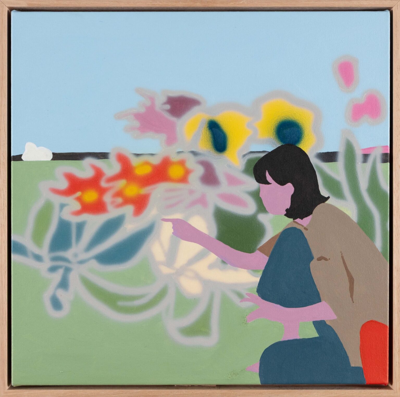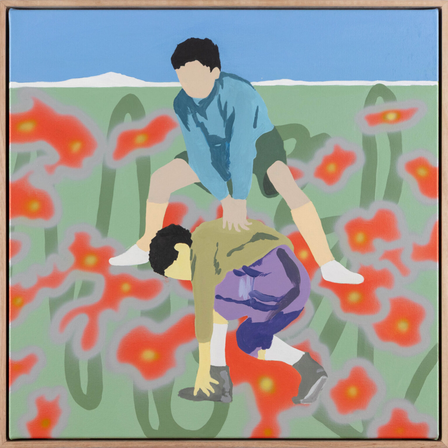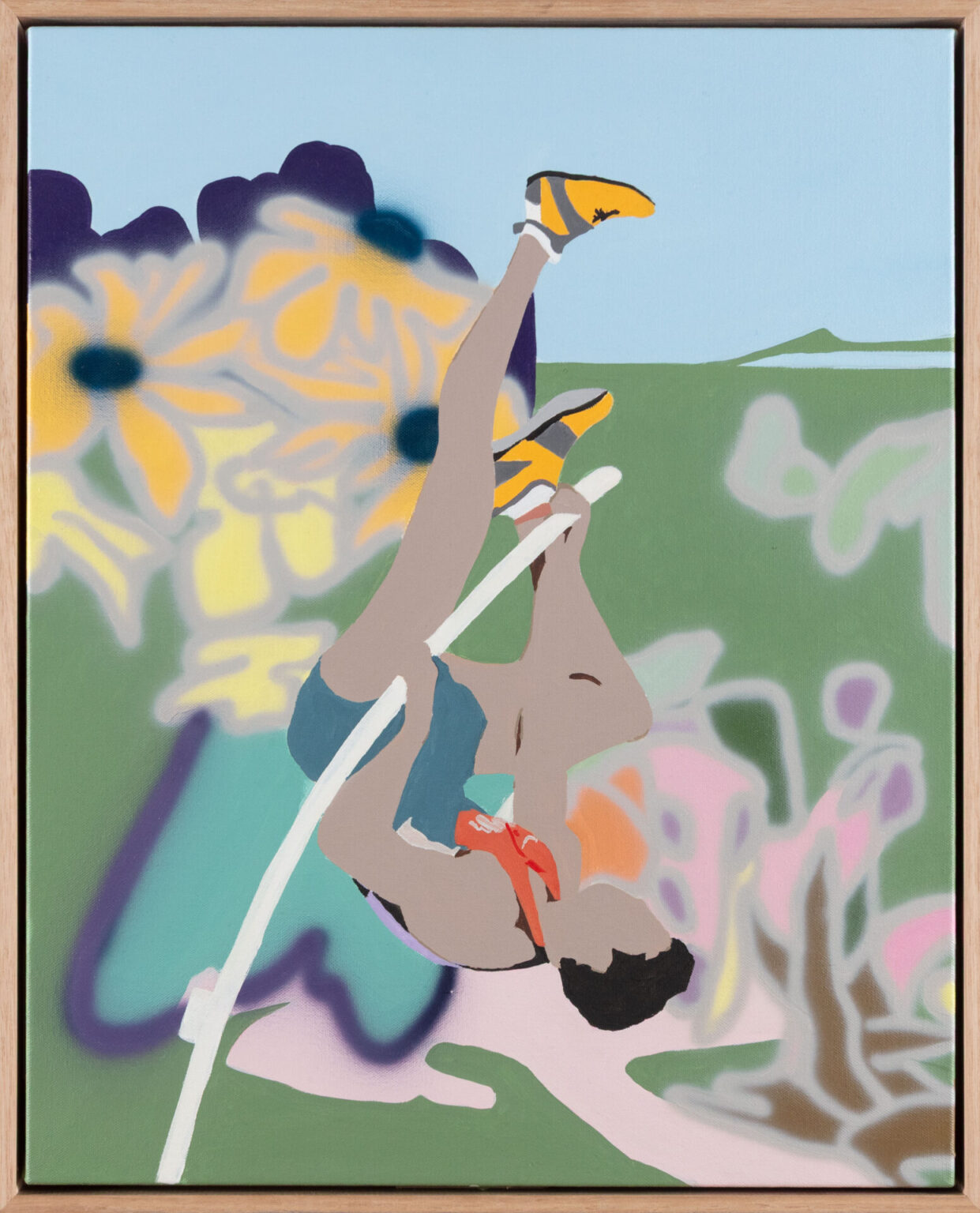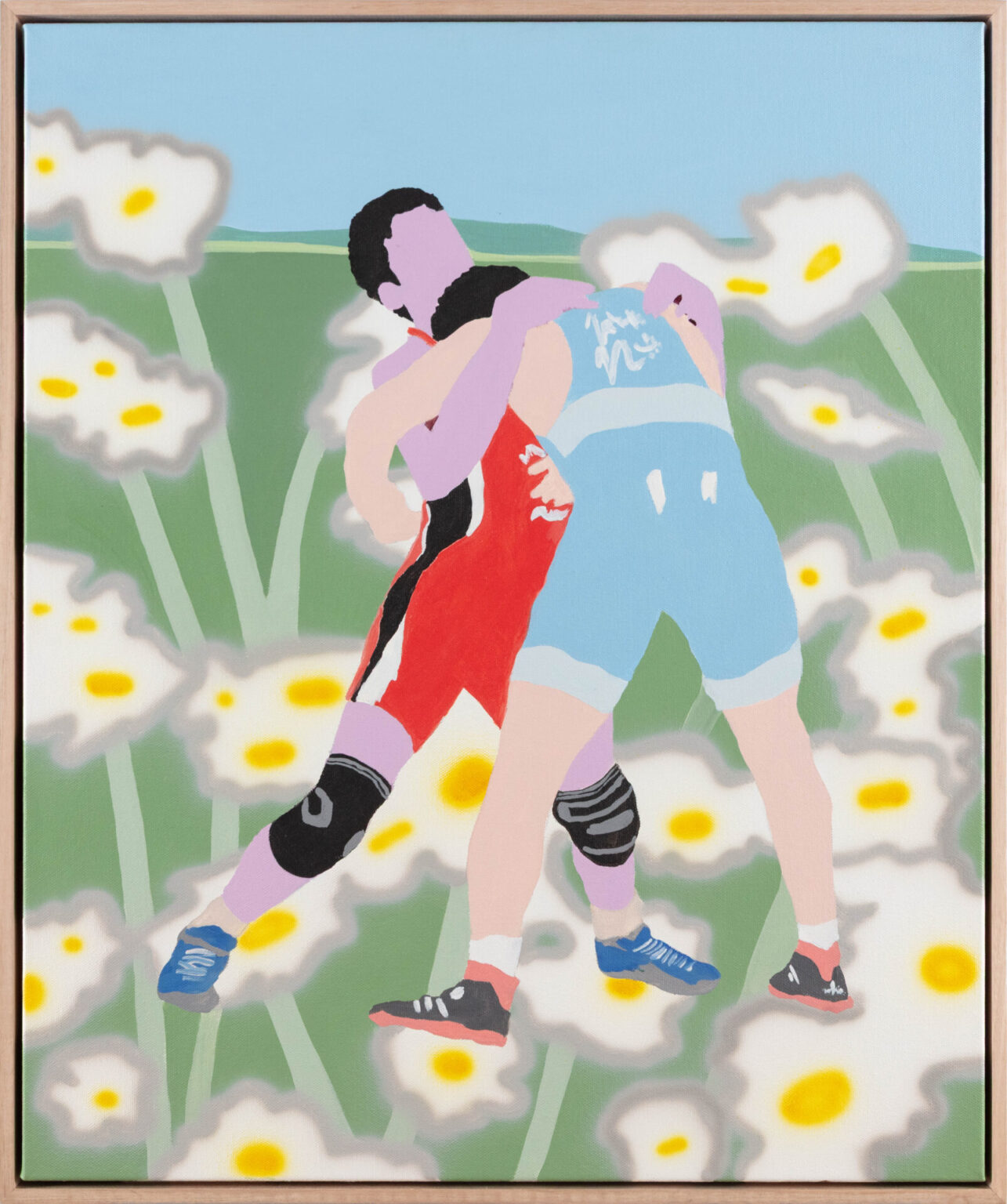 Sharpening her striking juxtaposition of painterly approaches, Guo sets silhouetted figures engaged in sporting pursuits against airbrushed, pattern-like fields of abstracted florals. Pole-vaulters arc, wrestlers embrace and sprinters are caught mid-stride as the clash of painterly techniques skews spatial perspective – flattening athletic or childlike subjects at play against soft-focus grounds.