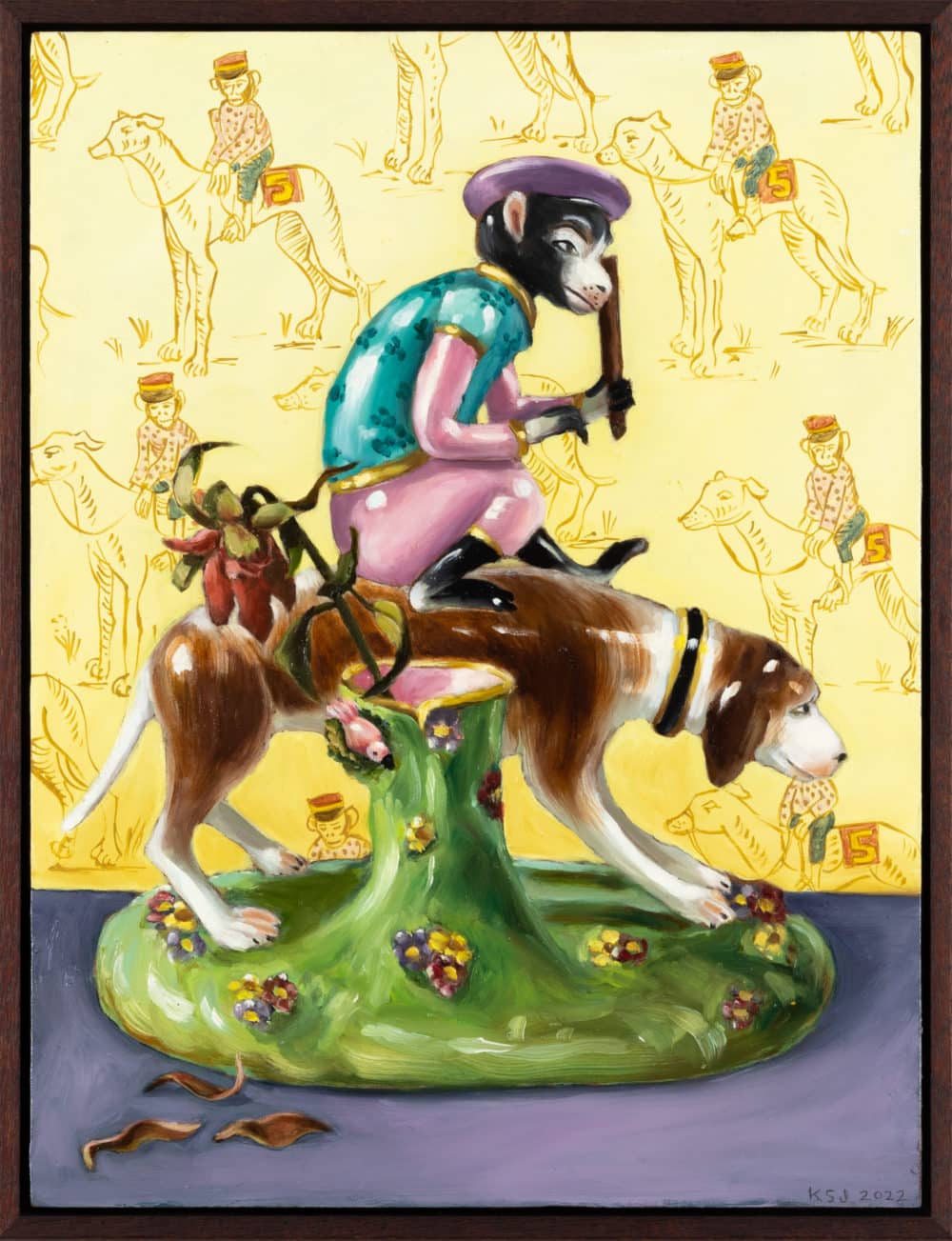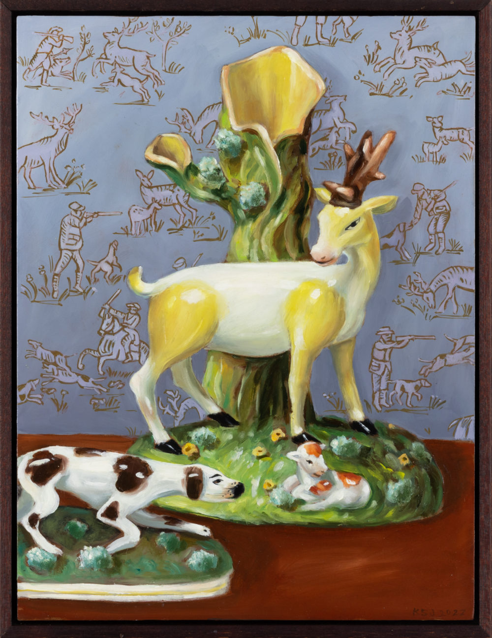 Sellars-Jones’ talents are on full display in this beautiful series of “Staffordshire” paintings. These figurines, came to represent the culture of their time, depicting both the mundanity of daily existence along with both fame, crimes and scandals of the day. They are both charming and innocent, menacing and cruel, while loaded with social and political references.