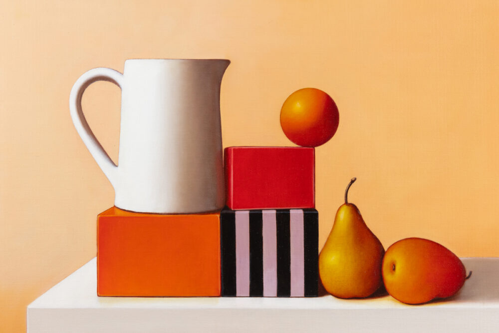 Hale’s ‘Summer Lingers On’ exhibition beautifully captures the tranquil elegance of everyday objects, conjuring a masterful interplay of light and shadow. Soft, natural light gently illuminates floral arrangements and compelling glass displays, casting subtle variations in tone and texture that bring an almost tangible quality and depth to the composition.