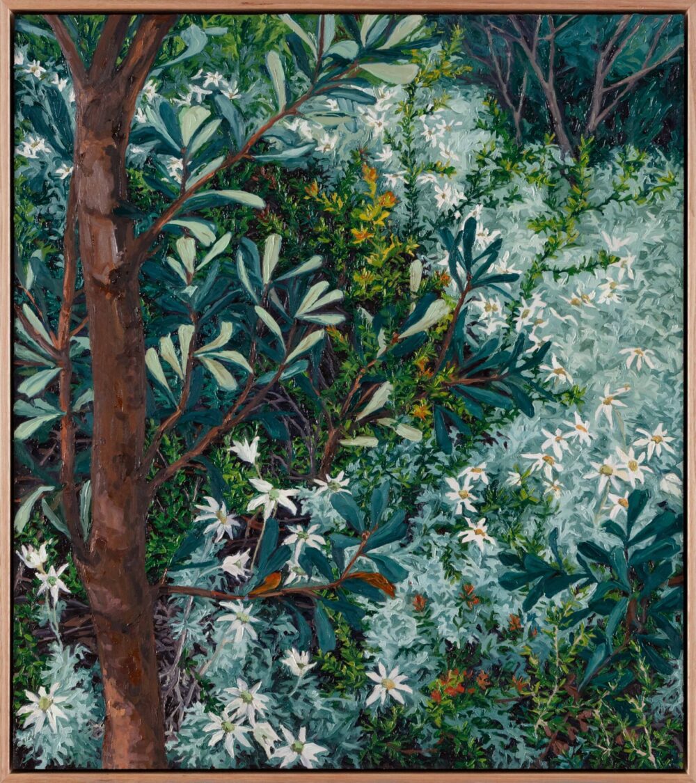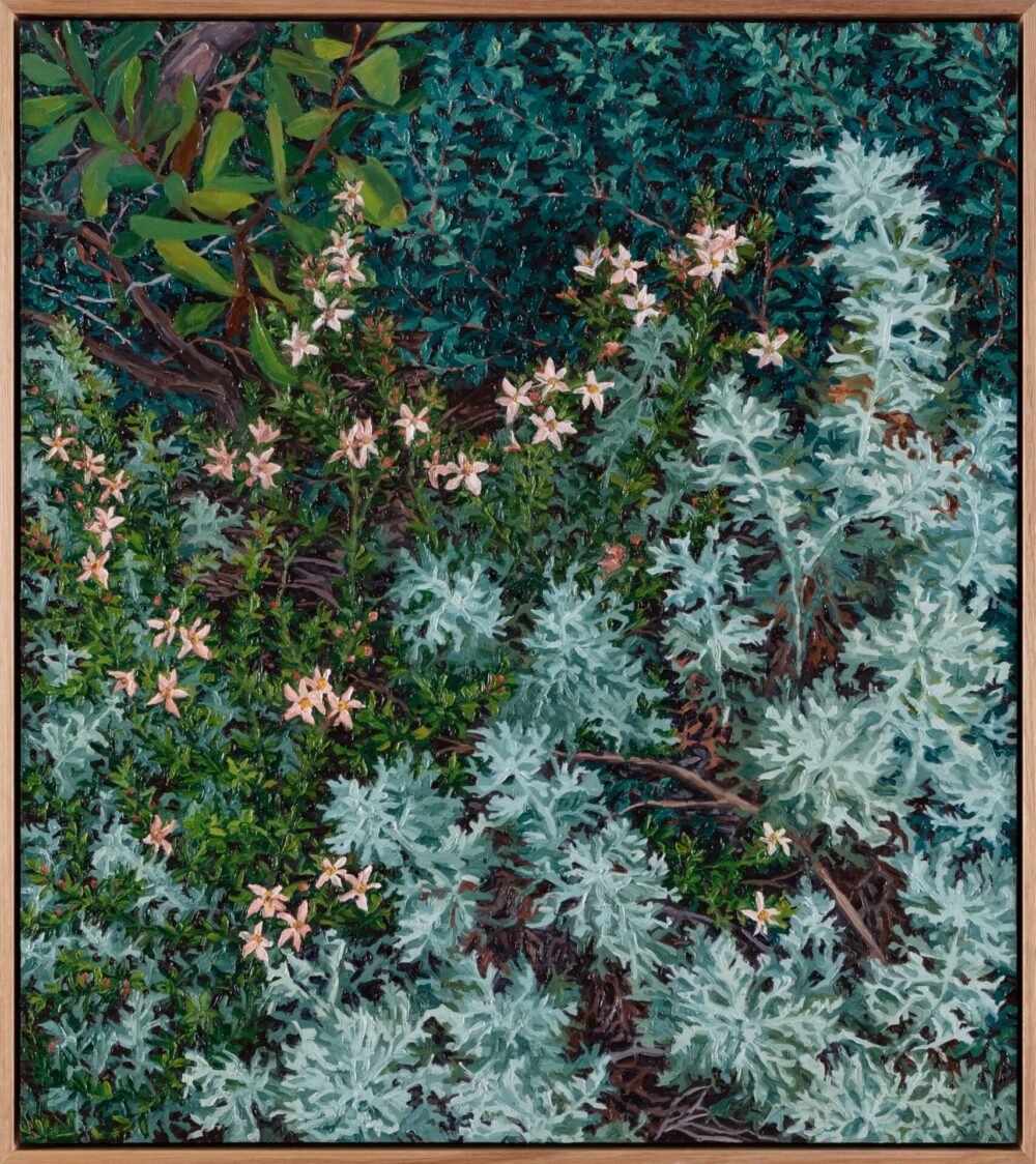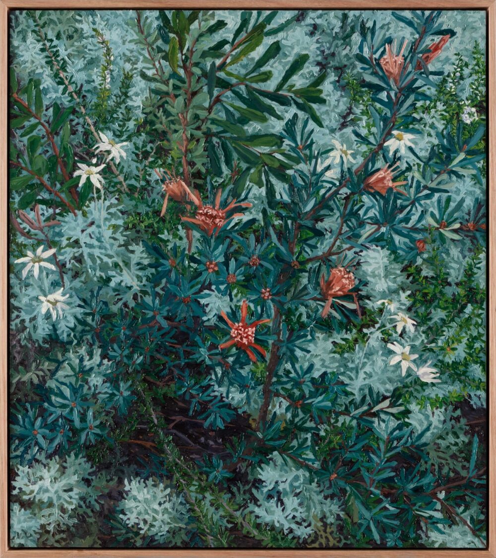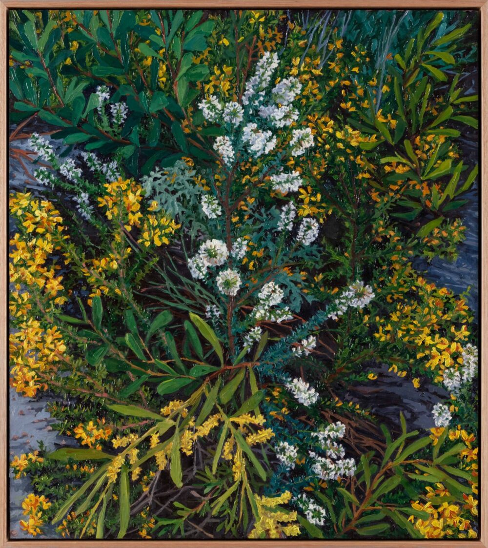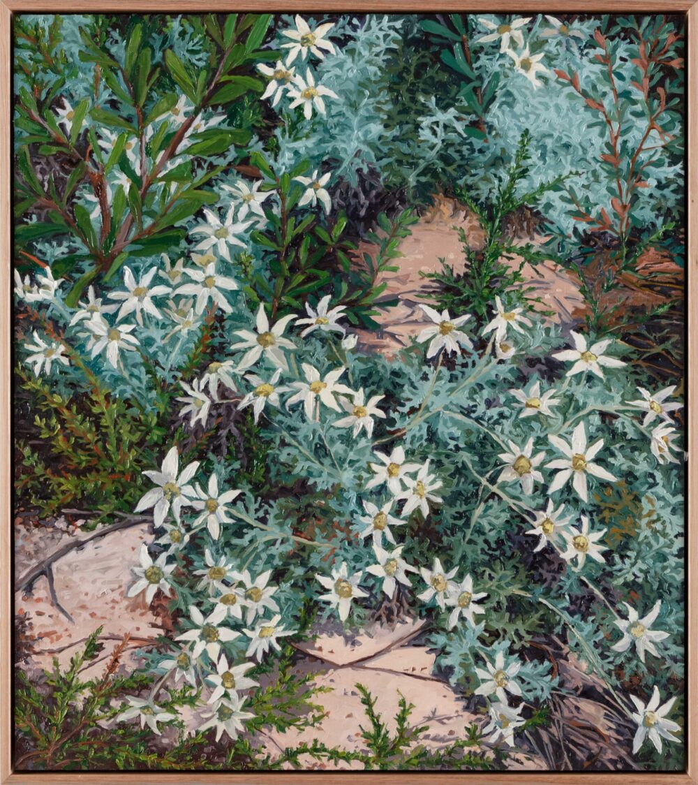 Building on the creative breakthrough of her widely celebrated solo show Understory – as well as her collaboration with fashion brand Nancy Bird, which saw her elegant flannel flowers and other painted botanicals transposed onto textiles – Tendils and Tapestries displays a dazzling profusion of native wildflowers that teem and tangle right to the edge of each canvas.