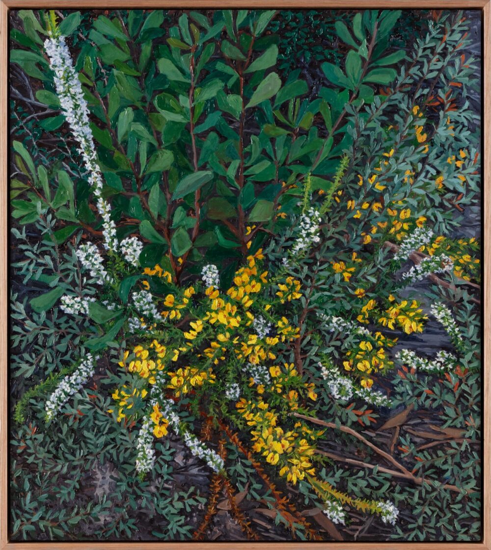 Moving with painterly gusto between areas of intricate and tightly controlled detail and an overall mood of untamed, impressionistic abundance, Frith’s Tendrils and Tapestries series takes us deeper into the thickets of the bushland covering Eora/Sydney North Head. Sketching in the field before returning to her painting studio, Frith observes and translates the area’s dense botanical interplay, seasonal shifts and the filtered patterns of light and shade cast across the forest floor.