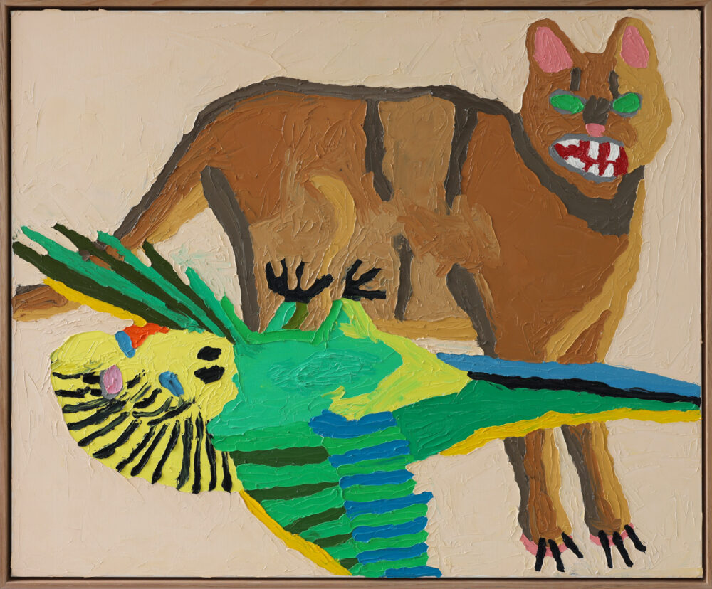 At Murrurundi, mythic cats and other wild and whimsical creatures prowl across the artist’s canvases and climb the blush-pink postmodern playground in which they are displayed. This magnificent menagerie is complemented by nods to Wedgwood-style urns and other decorative vessels that evoke mythologies and allegorical imagery from antiquity, albeit with lashings of vibrant contemporary style.