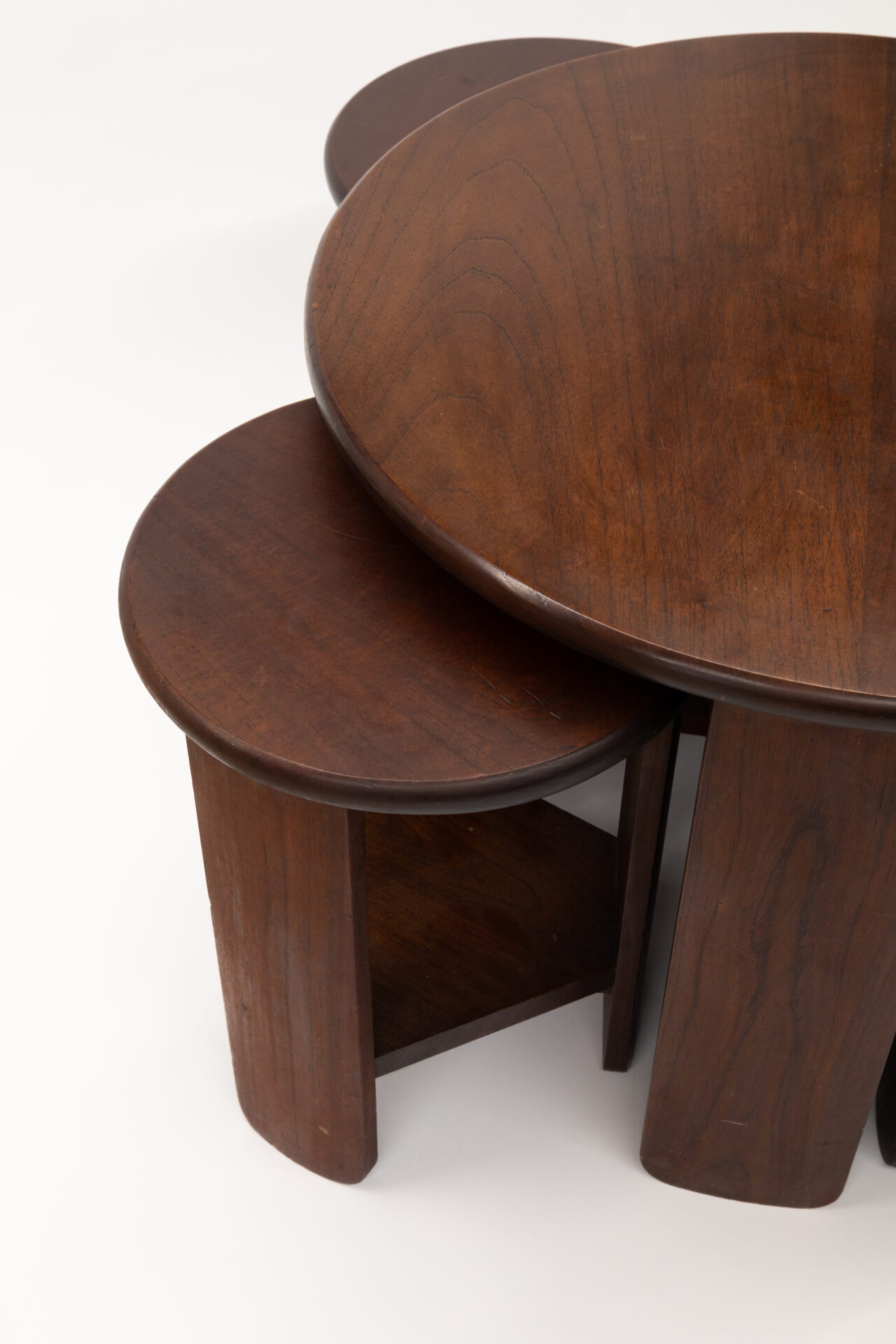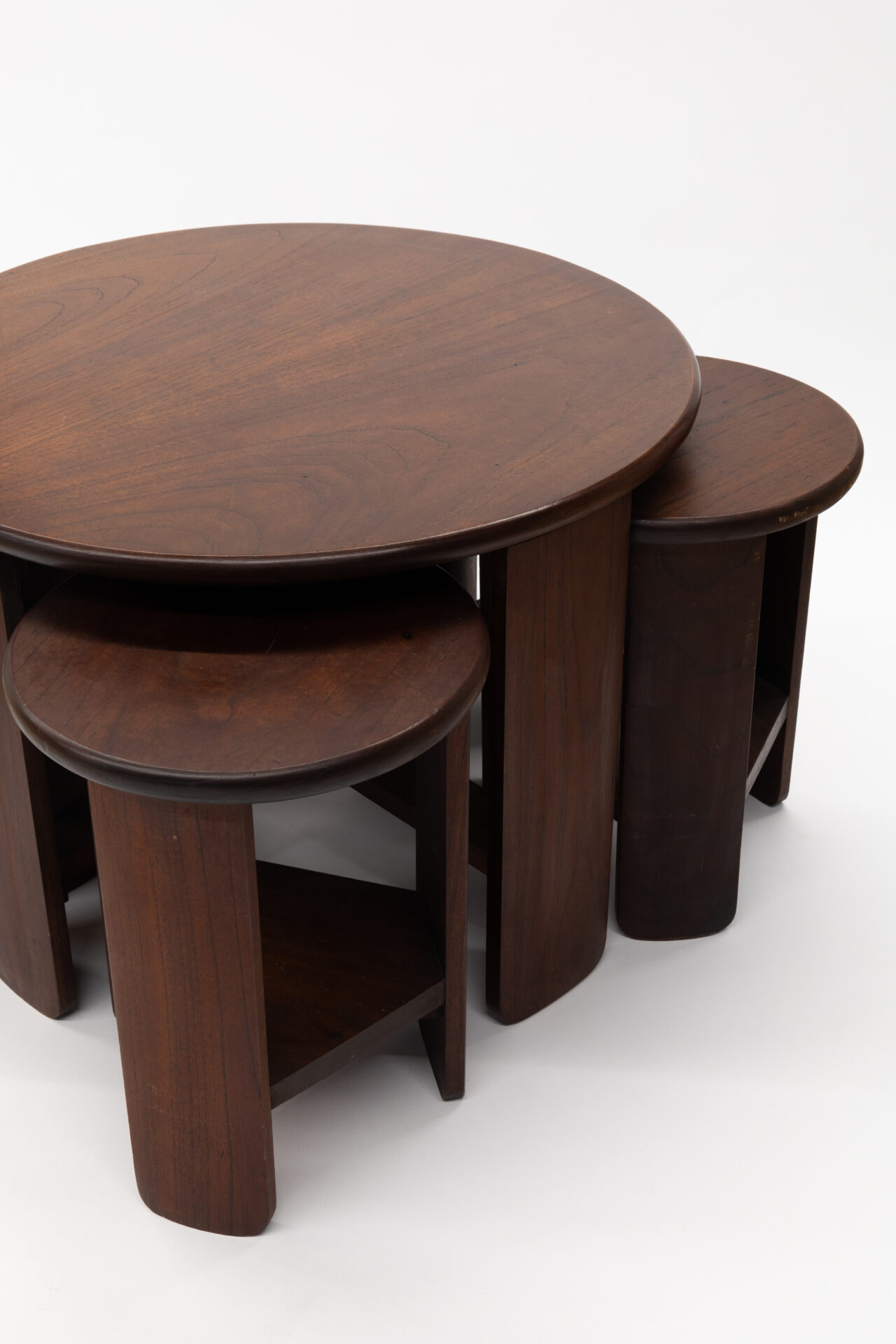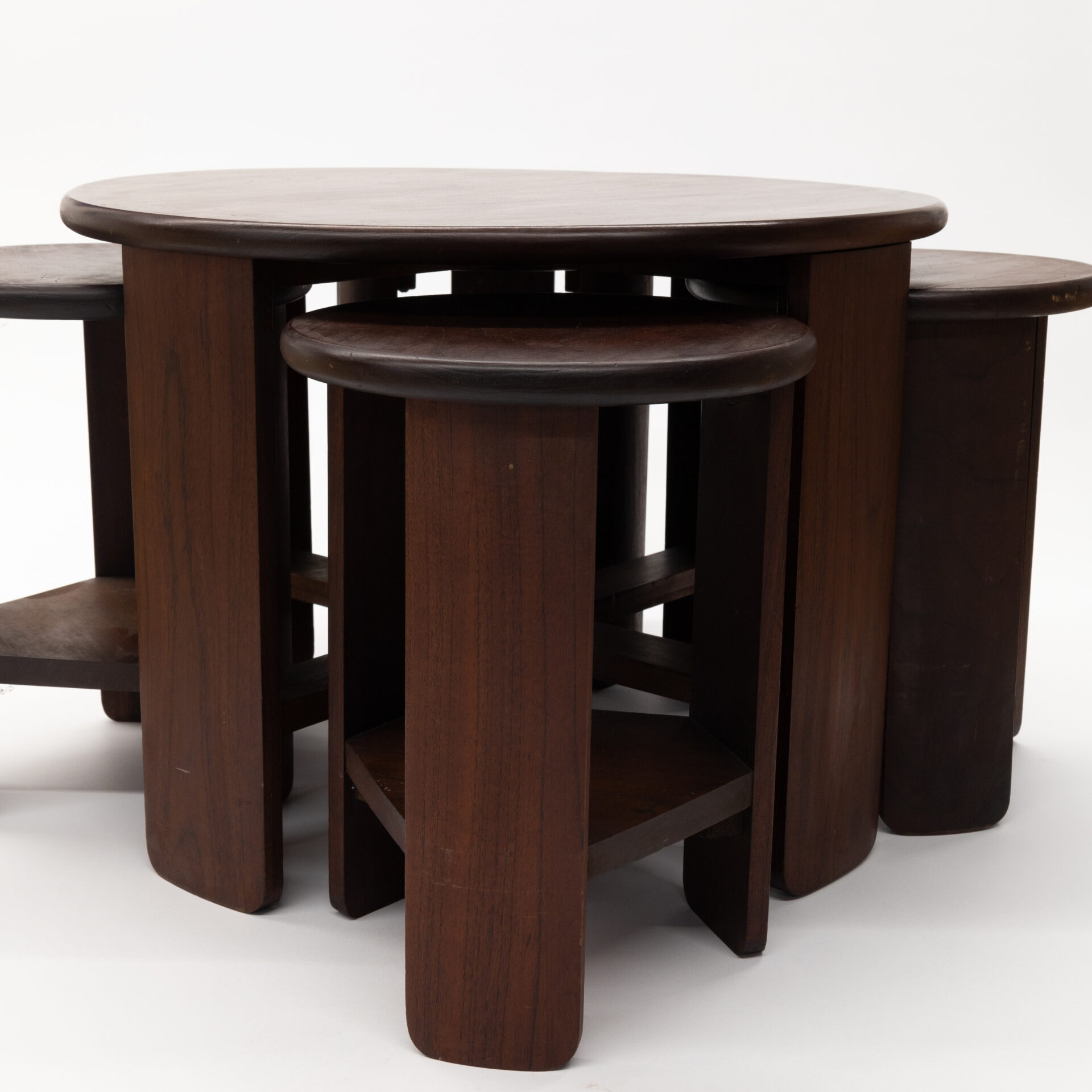 A handcrafted Australian design, this bespoke nest of tables is made from solid teak and offers both beauty and practicality. The circular table is paired with four curved nesting stools that tuck seamlessly beneath, creating a compact and versatile piece.