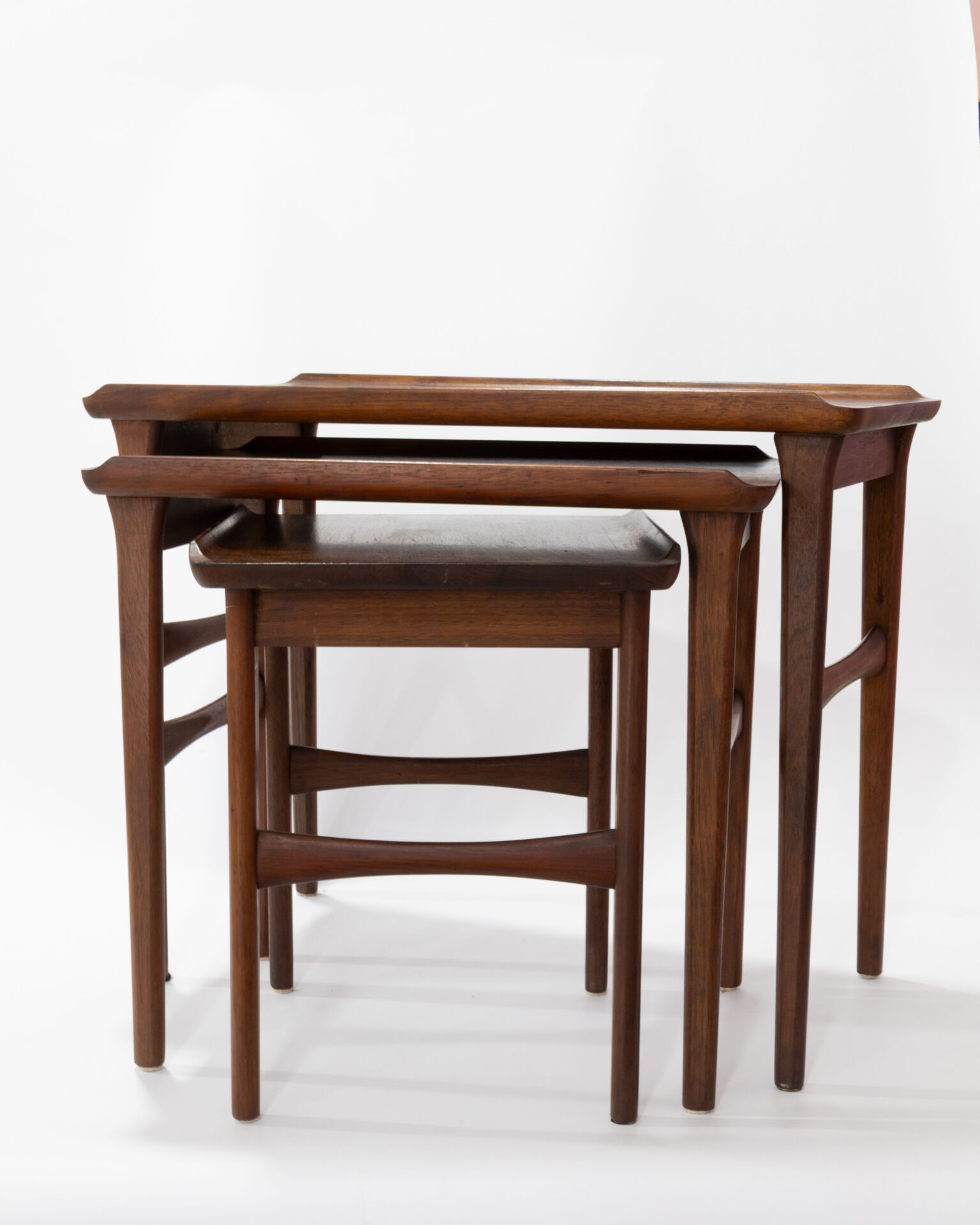 A beautifully crafted set of three nesting tables by Burgess Furniture, made from solid blackwood throughout (not veneer). Each table features a distinctive curved lip edge and tucks neatly beneath the next for effortless space saving and versatility. In excellent original condition, the set showcases a rich, dark patina that speaks to the quality of its materials and careful use over time.