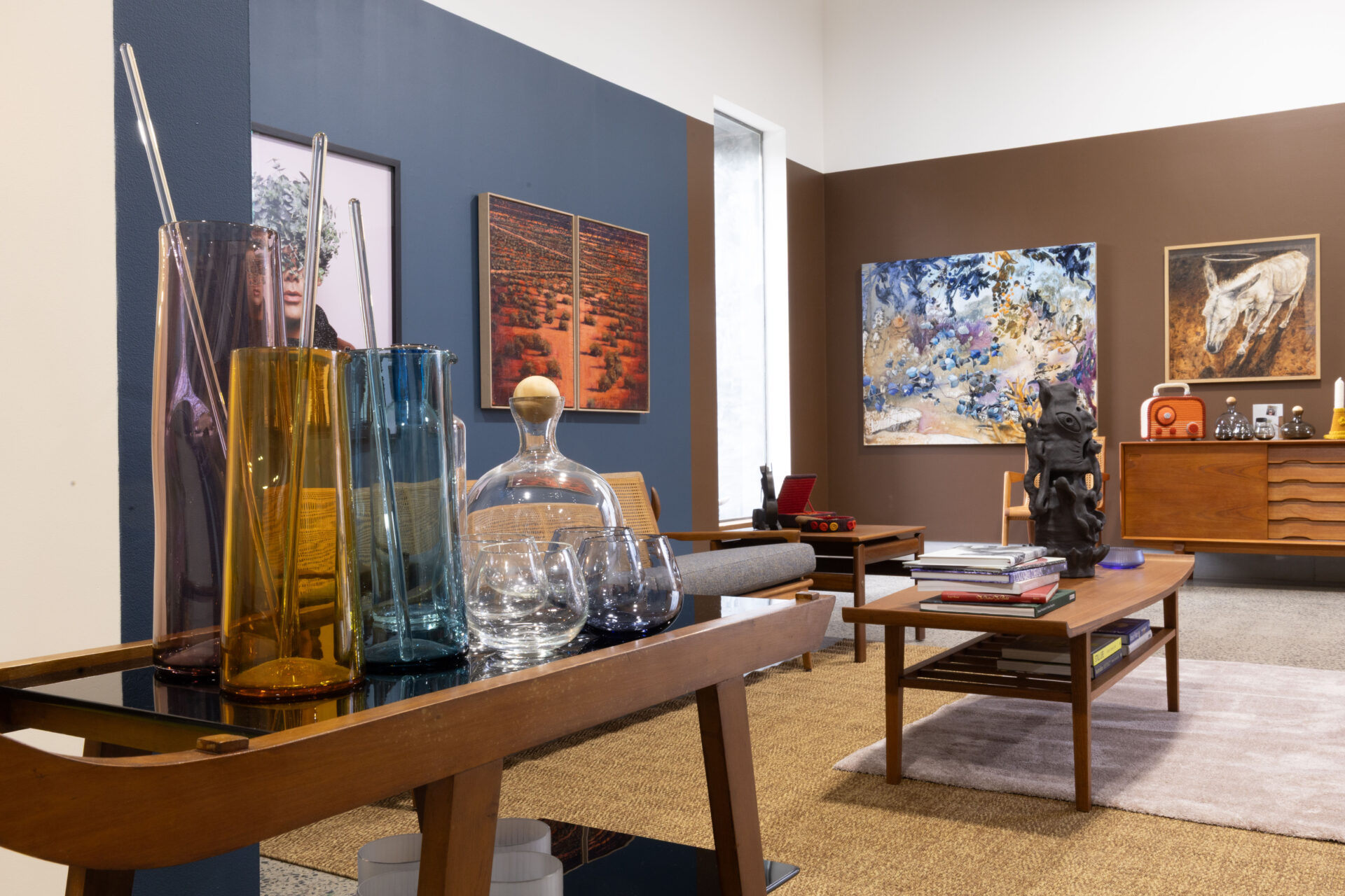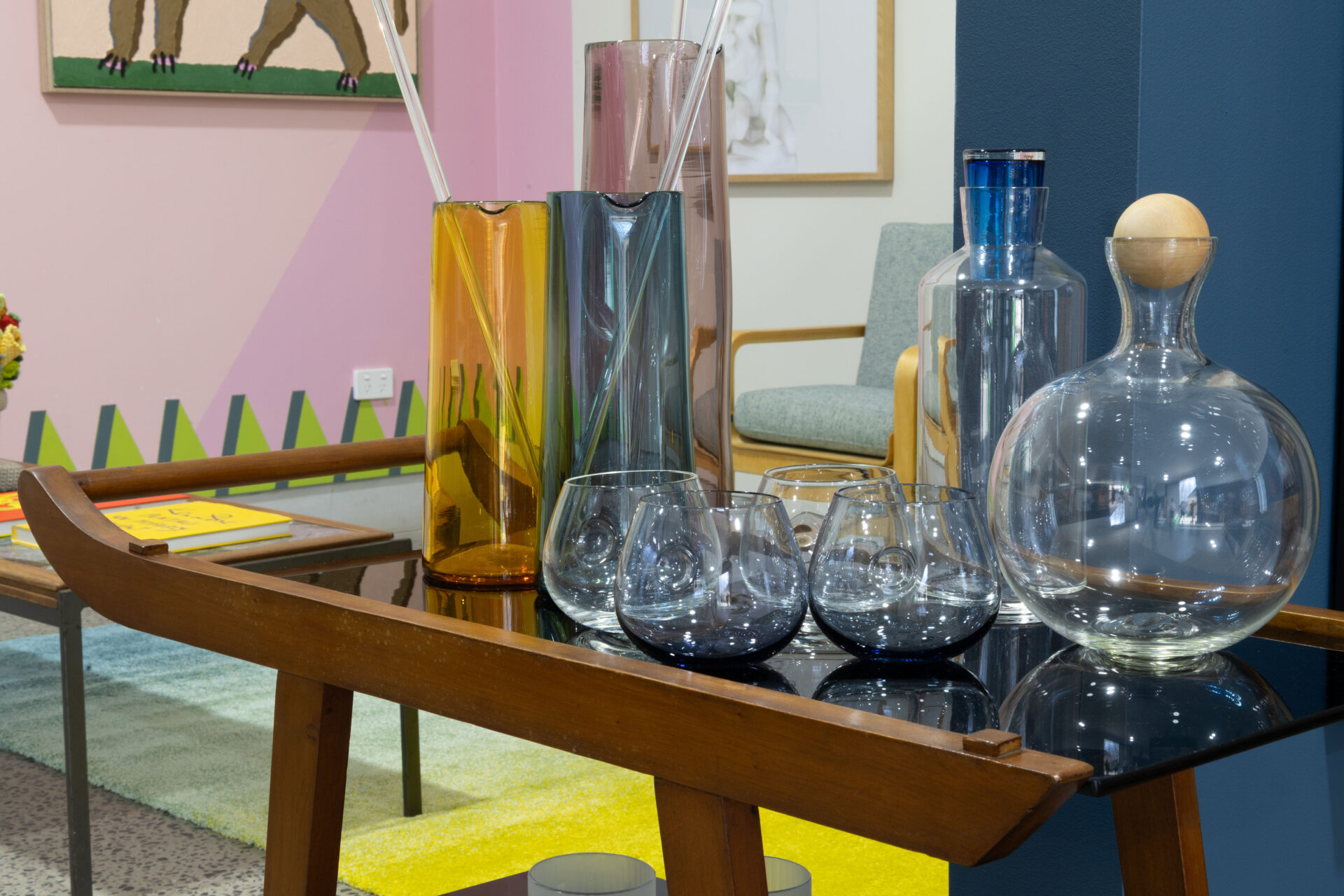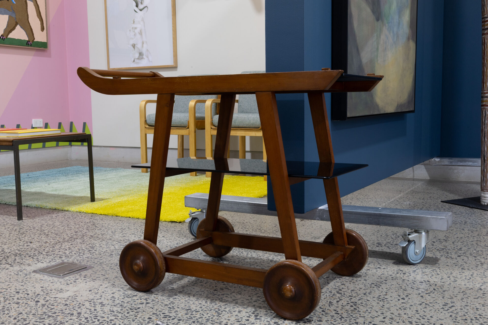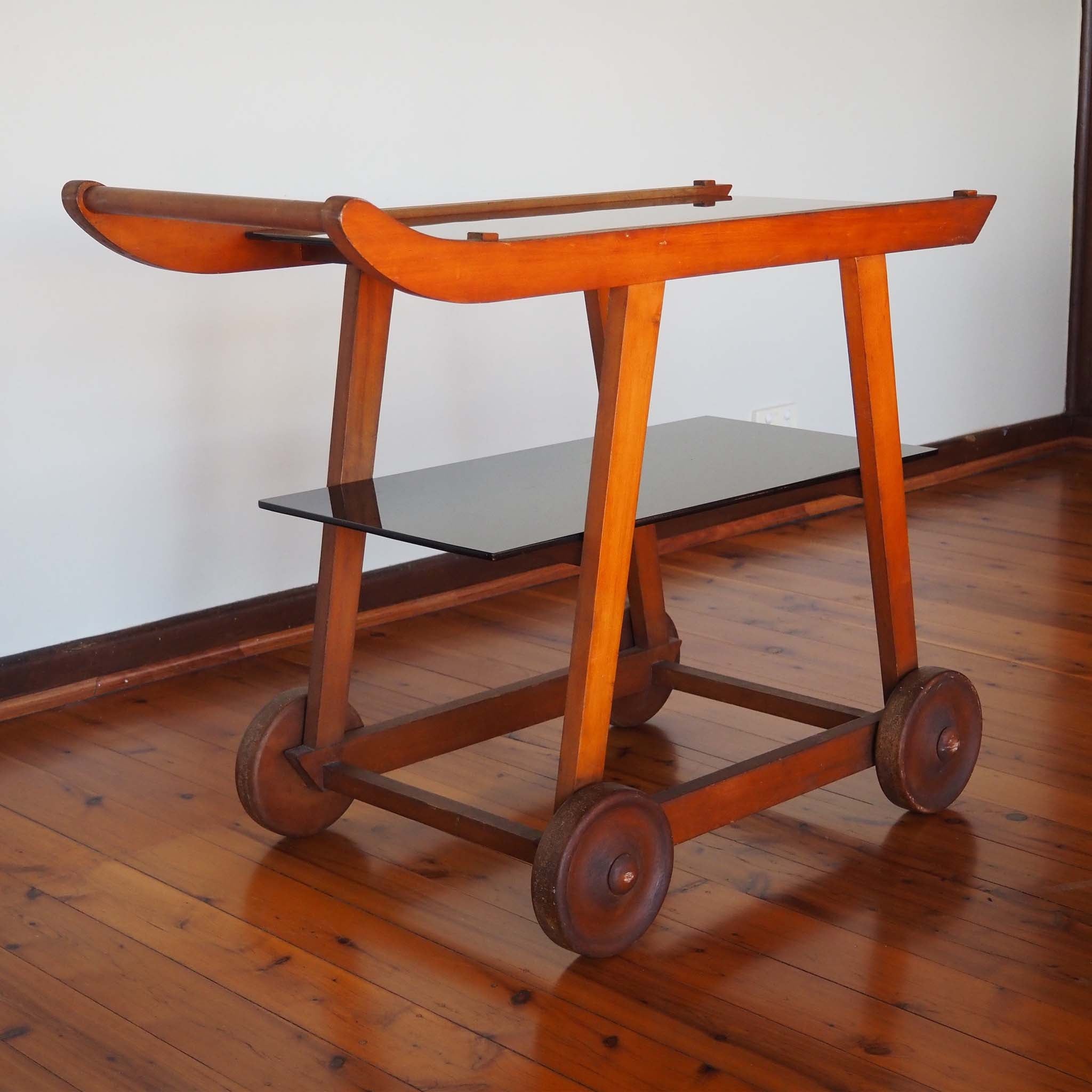 A rare and iconic drinks trolley by Hungarian-born architect George Korody (1890–1957), crafted in solid Coachwood and featuring its original black vitrolite glass shelves. Designed and sold through Artes Studio, this piece is one of Korody’s most sought-after works. Beautifully proportioned, it features sculptural, hand-turned timber wheels and removable shelves that can be reconfigured as a serving table; an ingenious design detail typical of Korody’s functional modernism. In lovely original condition, with a rich patina and minor knocks consistent with age, this piece offers both rarity and character in equal measure.