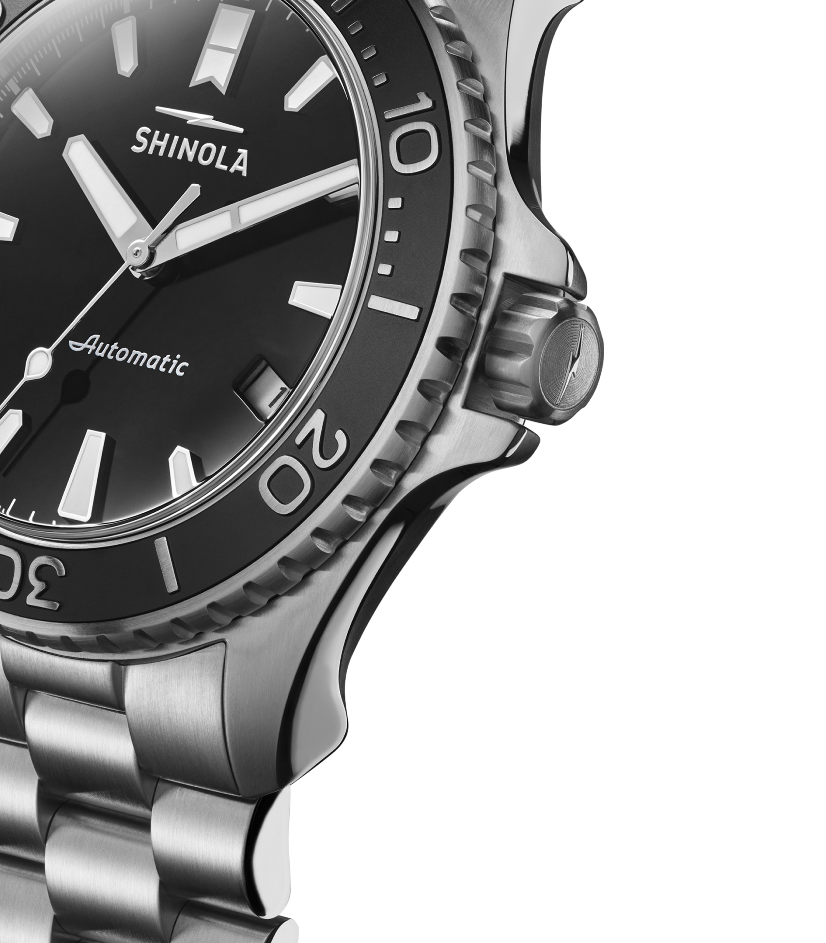 Glossy black dial with Super-LumiNova indices, diver-down flag at twelve o’clock and date aperture.