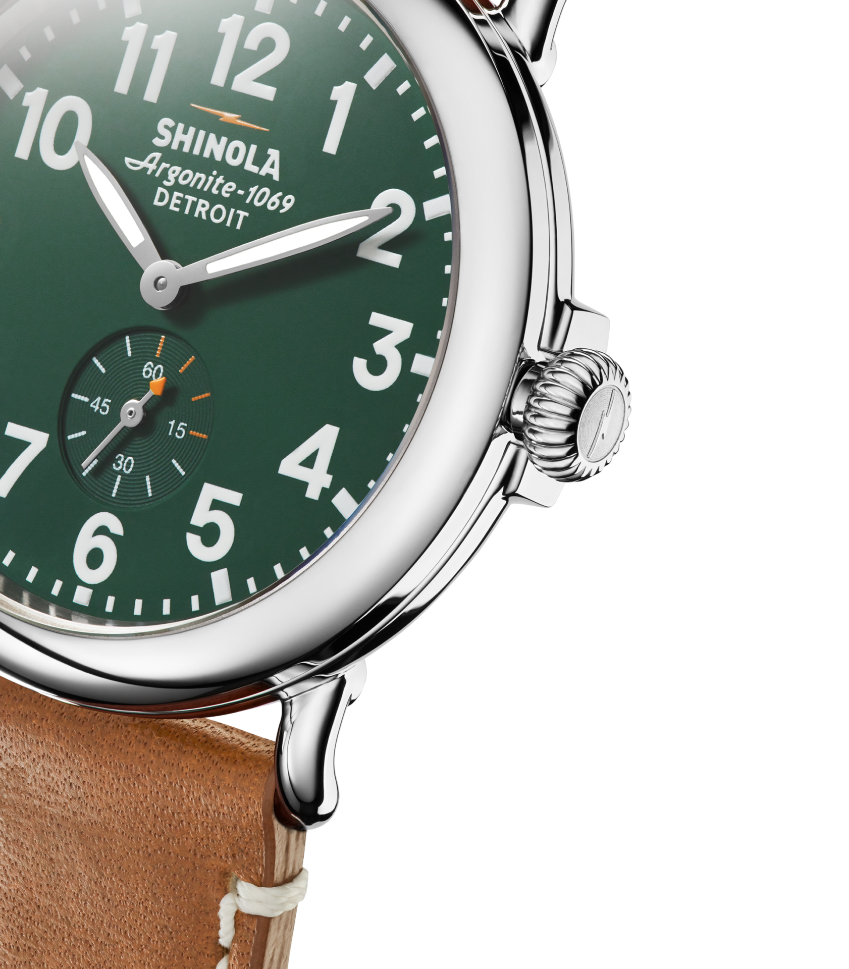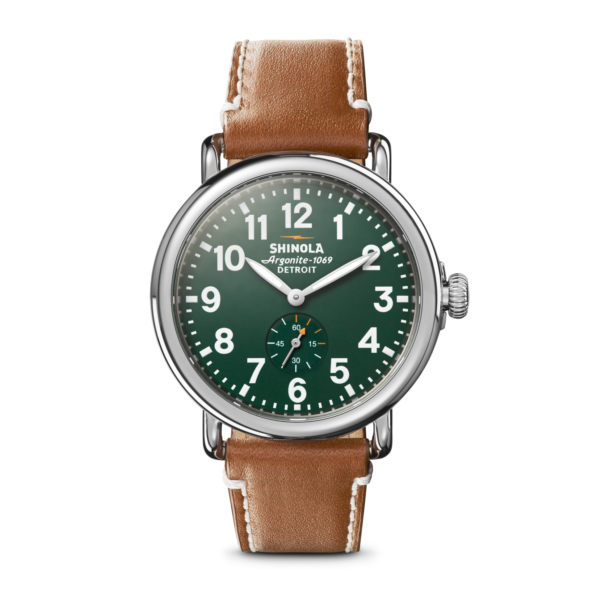 It is hard not to admire a face like this. The Runwell 41 millimetres features a rich green dial set within a polished stainless steel case, finished with Shinola’s signature pumpkin crown. A double-domed sapphire crystal protects the watch from scratches through years of wear. The maple leather strap develops a natural patina over time, giving each timepiece a distinctive character.